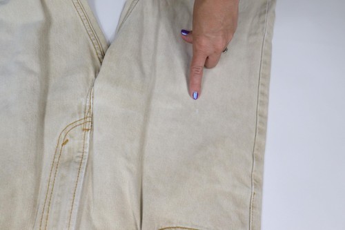 Hole back left pocket. Distressing cuffs, waist and hand pockets. Blemishes front and back. Has color fade