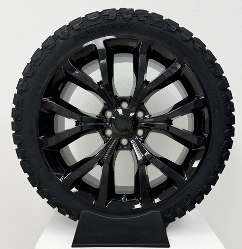 New Set Of Four Ford Style Replica 22" Gloss Black Snowflake Wheels With New Blackhawk Ridgecrawler R/T 285/45R22 Tires with TPMS Installed.