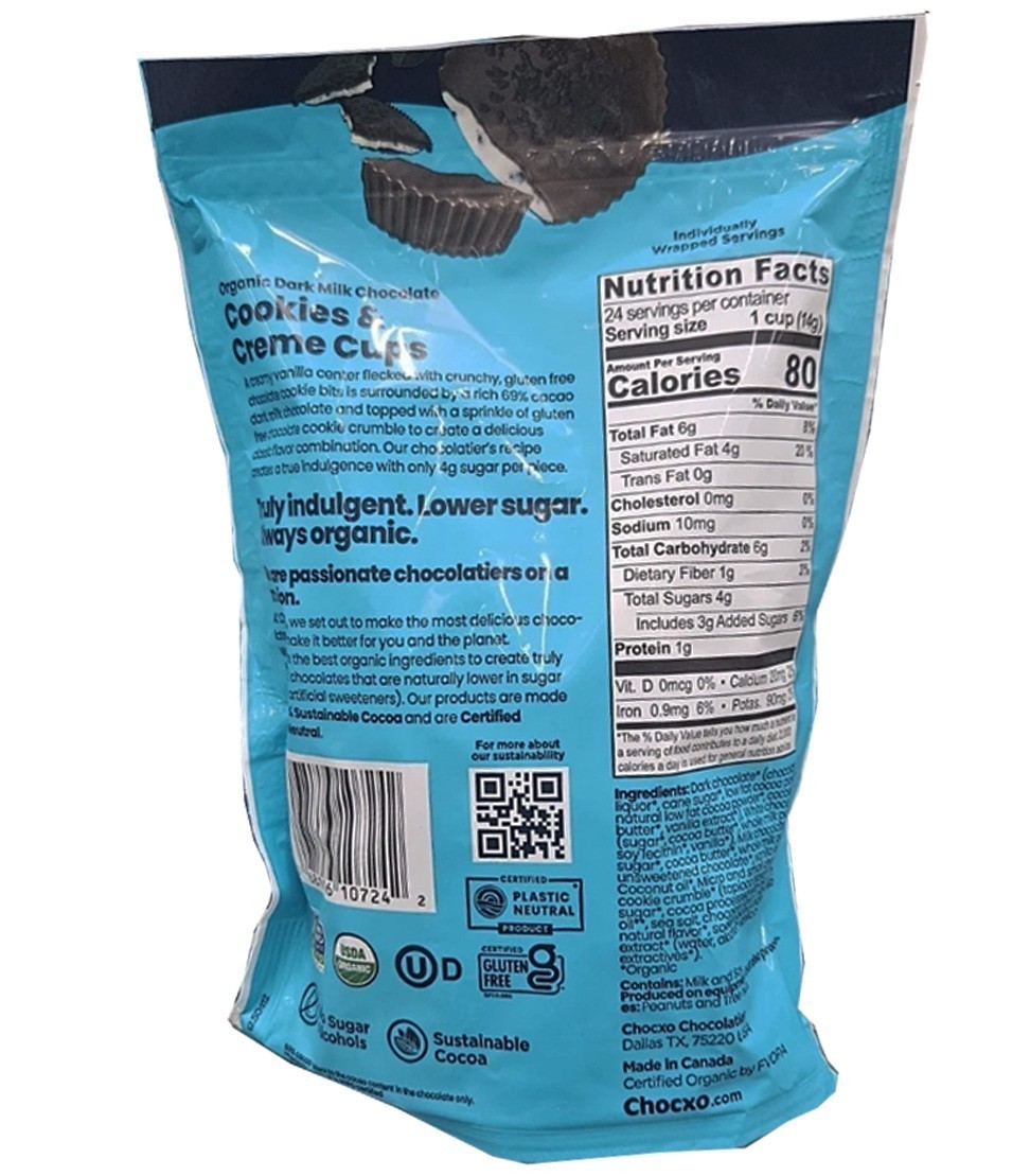 The Chocxo Dark Milk Chocolate Cookies Crem Cups are a decadent treat made with high-quality ingredients. Each serving contains 80 calories, and there are a total of 24 servings in this package. Made in Canada, these chocolate sweets provide a rich and flavorful experience with every bite. The dark milk chocolate flavor is perfect for those looking for a sophisticated and indulgent snack. The expiration date is January 2026, ensuring freshness and enjoyment for a long time to come.