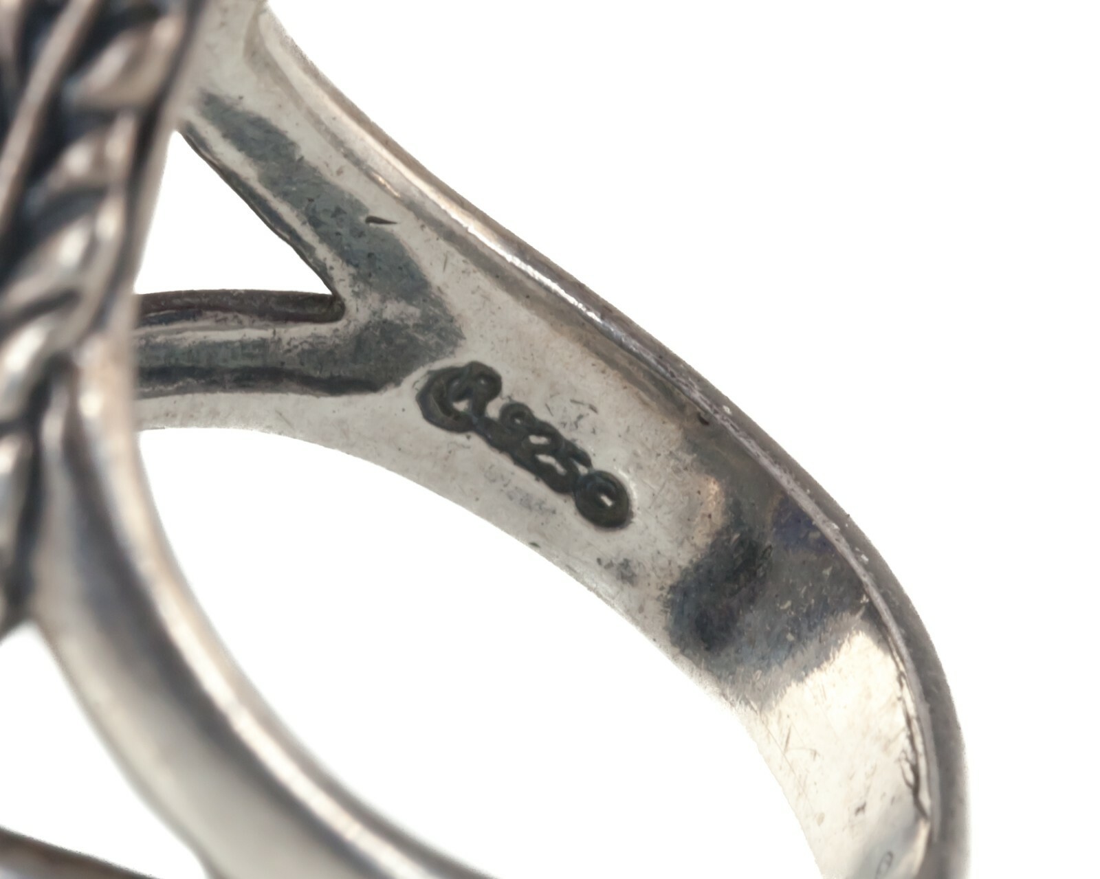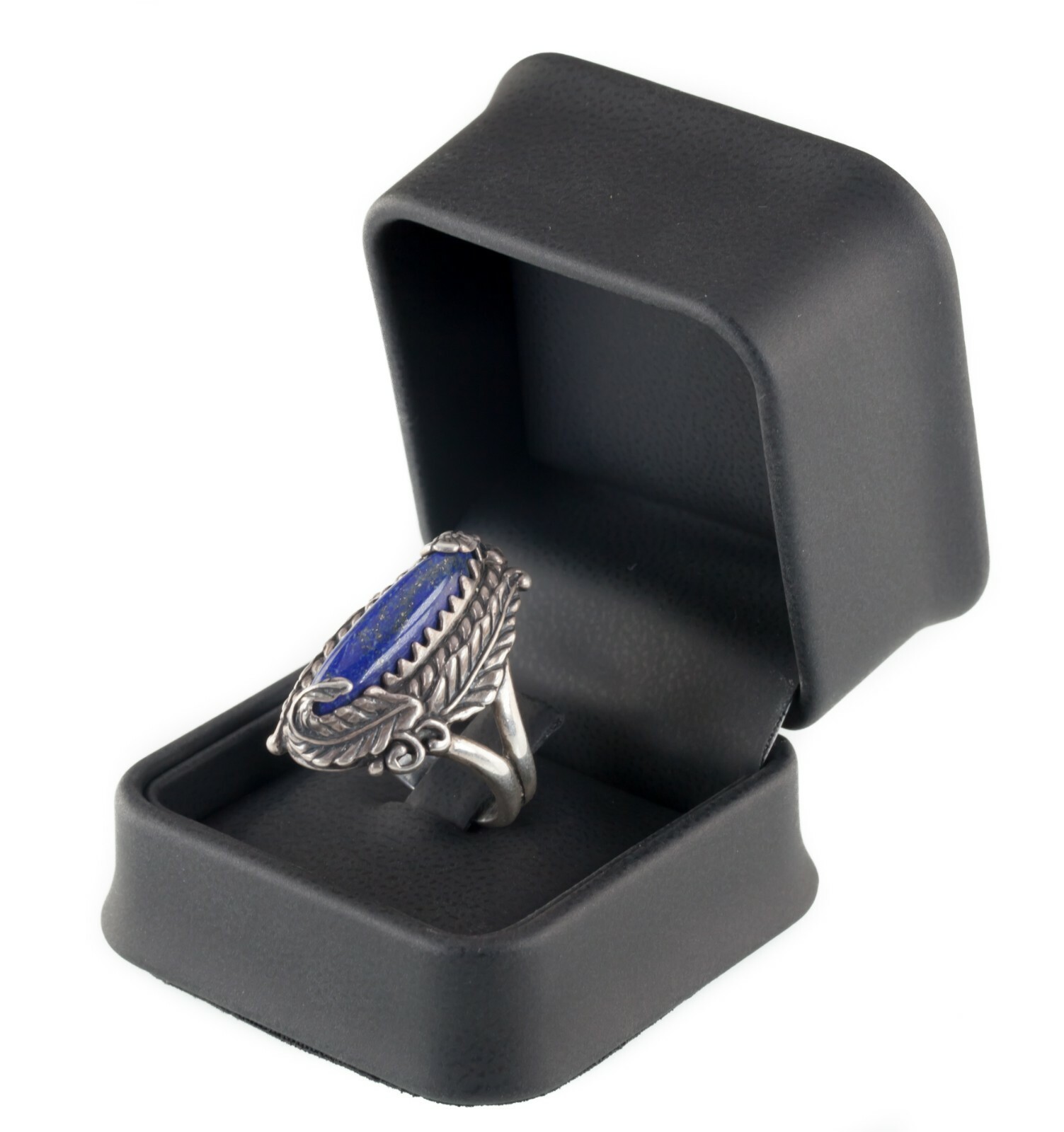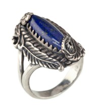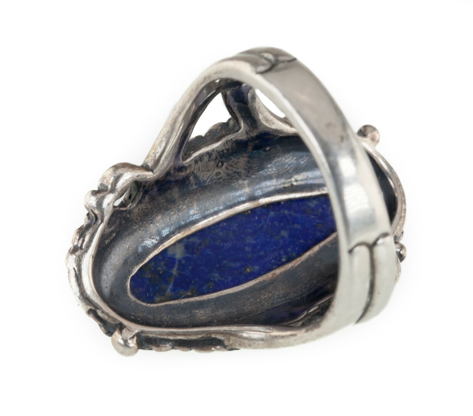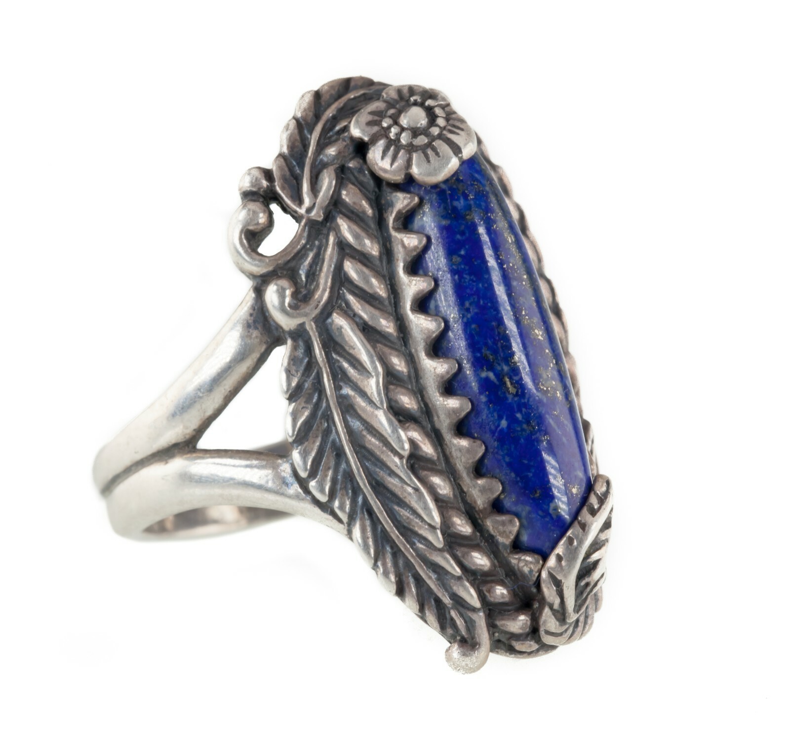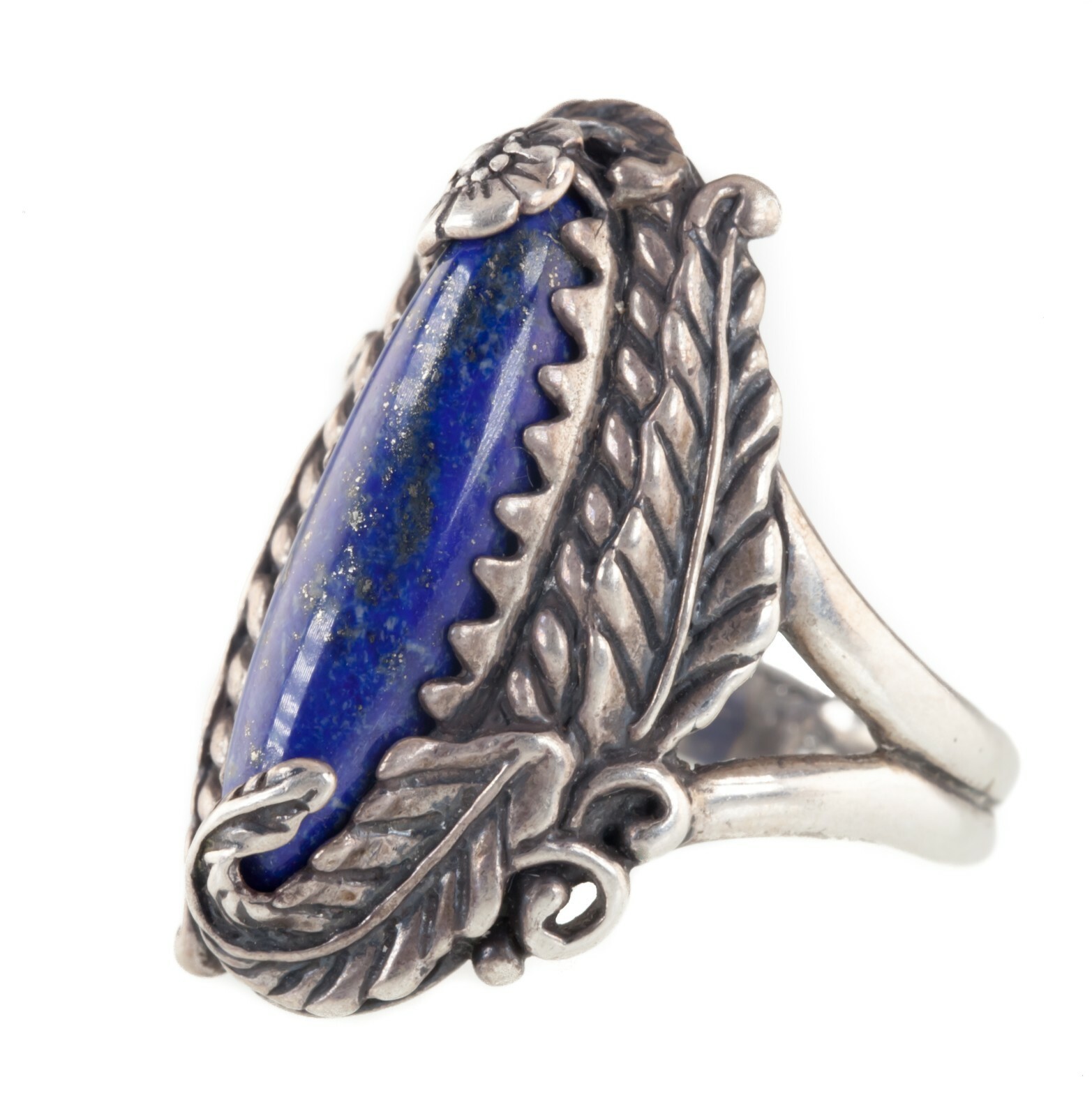 Features a cabochon elongated oval Lapis that's bezel set around flower and leaves