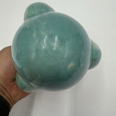 The Roseville Art Pottery Ixia Art Deco 1937 hanging pocket planter in turquoise is a rare vintage piece from North America. This 6? hanging planter features a unique Art Deco style, typical of the 1930s. Made in the United States using pottery techniques, this original piece is a beautiful addition to any art-themed decor, showcasing the brand's craftsmanship and aesthetic of the time period.