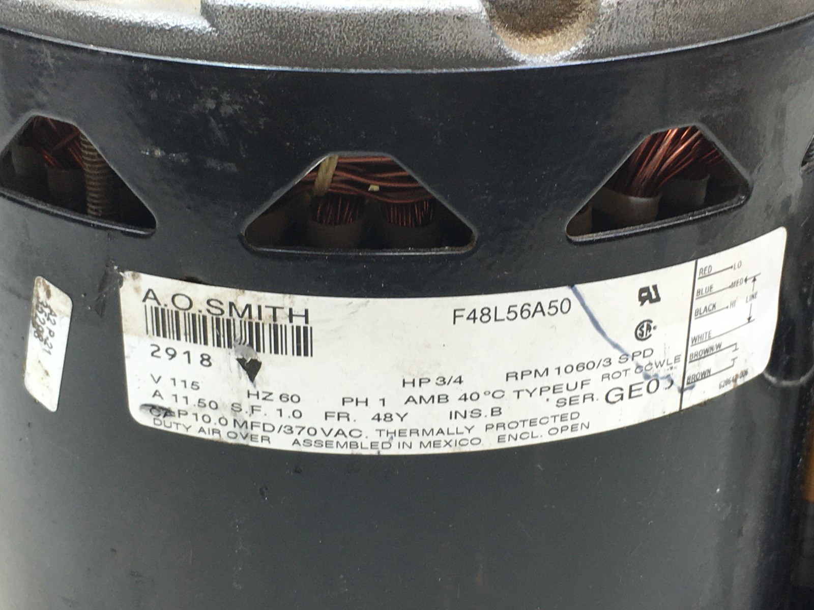 This is A.O.SMITH F48L56A50 Blower Motor 2918 3/4HP RPM 115V RPM 1060/3SPD used part, comes with a brand new capacitor.