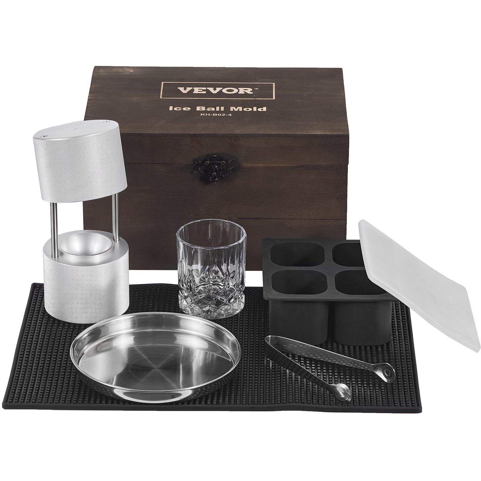 VEVOR Ice Ball Press Kit, Aircraft Al Alloy Ice Press with IceBlock Mold, Large Mat, Tong, Drip Tray, One Glass, Round Ice BallMaker 2.4"/60 mm Ice Sphere, for Whiskey, Cocktail on Party Holiday