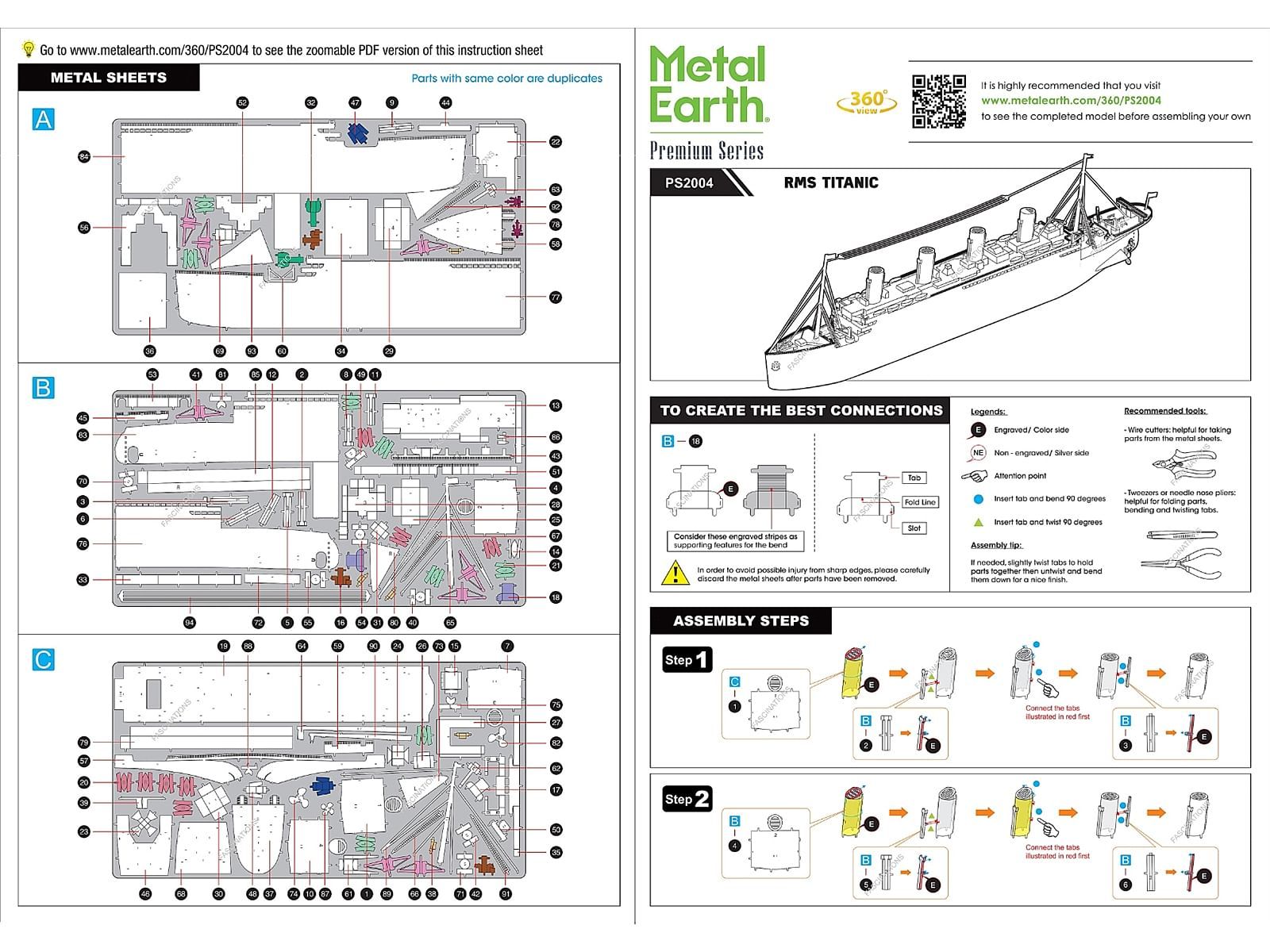 Brand new RMS Titanic Ship (Moderate Difficulty) Steel Model Kit by Metal Earth. Brand new box. Detailed exterior. Includes 125 parts. Highly detailed model kit. Difficulty level: Moderate. Officially licensed product. This model does not have any openings. Assembled dimensions approximately L-11.4, W-1.2, H-3.25 inches. No glue or paint is required, but tweezers or similar tools are recommended.