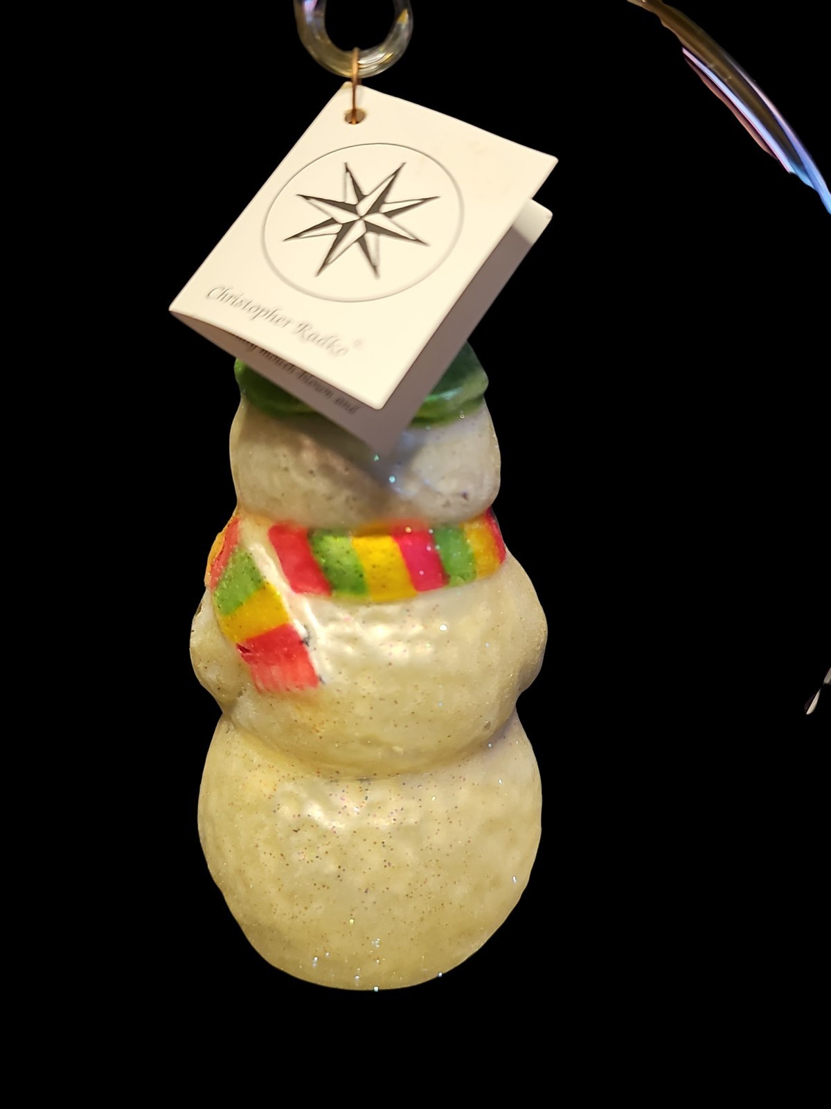 Adorable and retired Christopher Radko ornament "Miami Ice" from 1996, featuring a snowman with a citrus green hat and sparkly snow-textured body. Style #96-087-0. Measures approx. 5 inches tall.