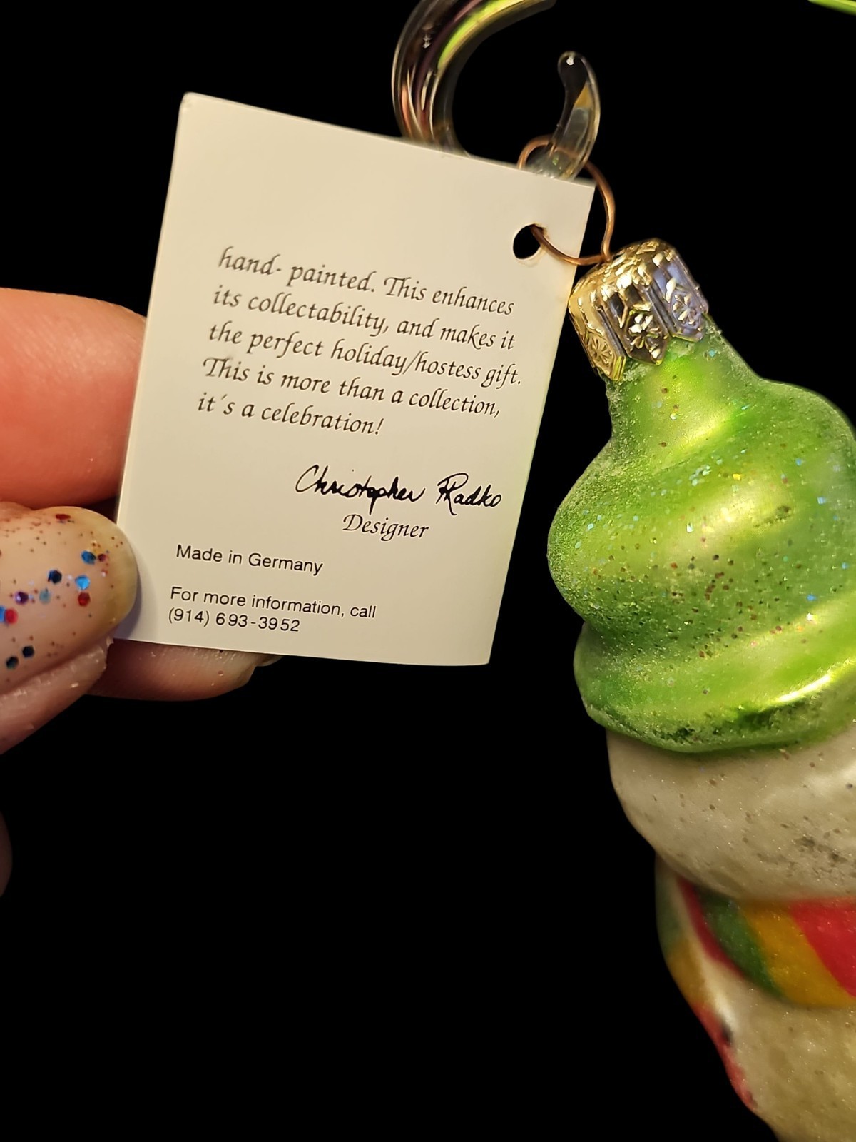 These estate-fresh ornaments are highly collectible and feature Radko?s signature craftsmanship: vibrant colors, detailed glitter work, and timeless holiday charm.