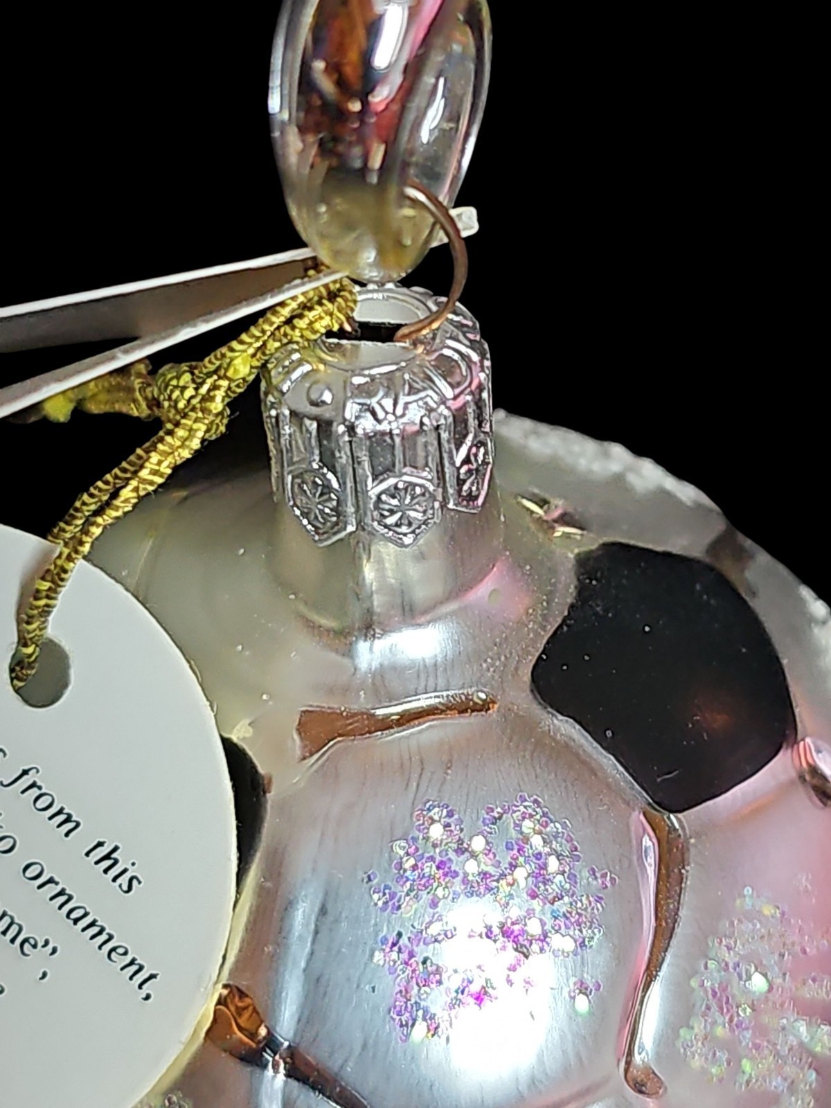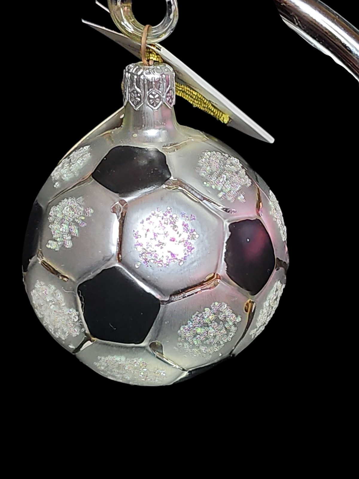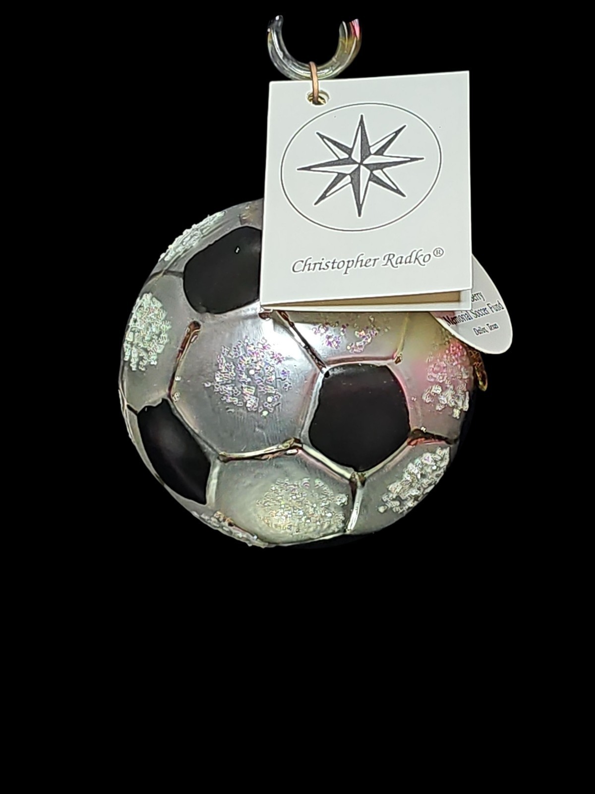 Retired Christopher Radko glass ornament titled "Mathew's Game," shaped like a sparkling soccer ball. Handcrafted in the Czech Republic and originally released in the mid-1990s. Features the original Radko charm and paper tag. Approx. 3.5" diameter. A fun and unique piece for Radko collectors or soccer fans alike.