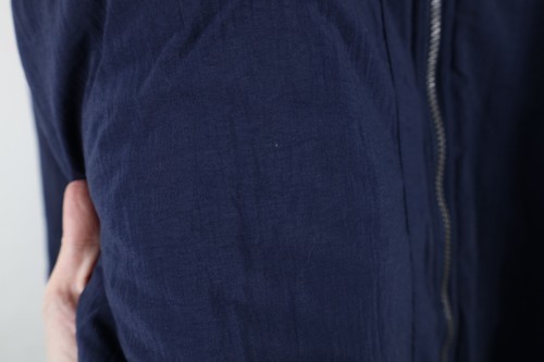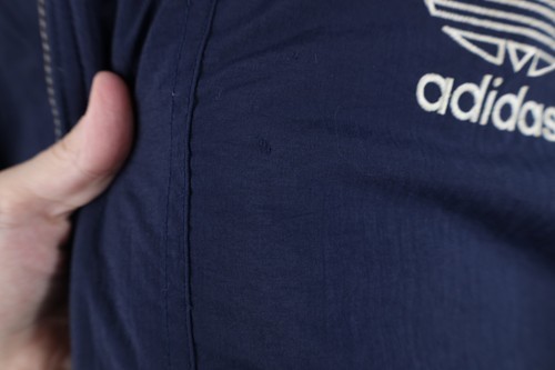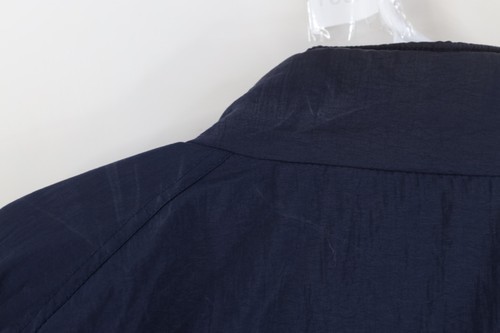 Reversible. Flat side: Hole front. Blemishes front, arms. Loose threads pockets. Designs distressed. Collar, cuffs discolored. Quilted side: Dark spots/discolored. Design distressed. Loose threads. Color faded