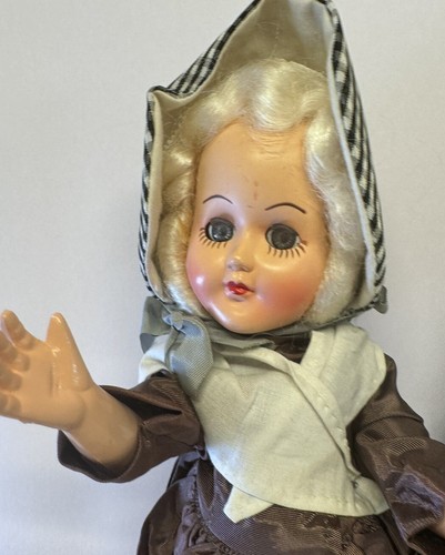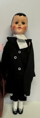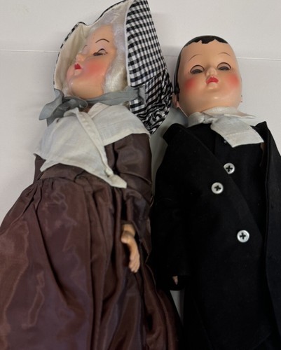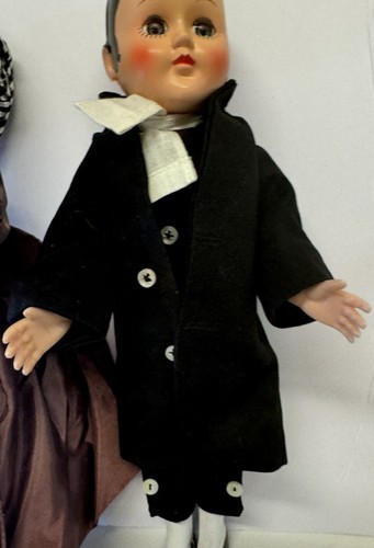 This rare vintage set of hard plastic colonial dolls features a mother and son, with lifelike eyes that open and close. The intricate details and design make them a unique addition to any collection. Dating back to the 1950s, these dolls are true vintage pieces that are sure to impress any collector. The dolls come from a character family that depicts a teacher and student, making them a great addition to any educational or historical display. Don't miss out on the chance to own this special piece of history!