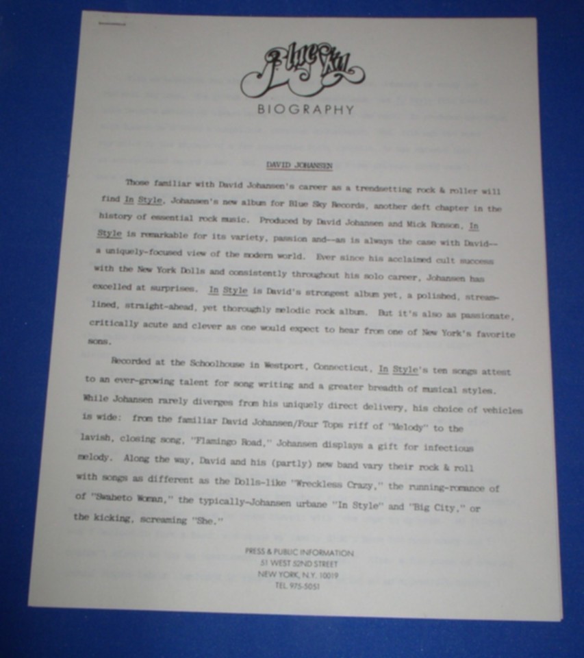 This is a vintage David Johansen press release. A 4 page biography from Blue Sky records. A terrific item for the fan or collector. Intentionally blurred for obvious reasons.