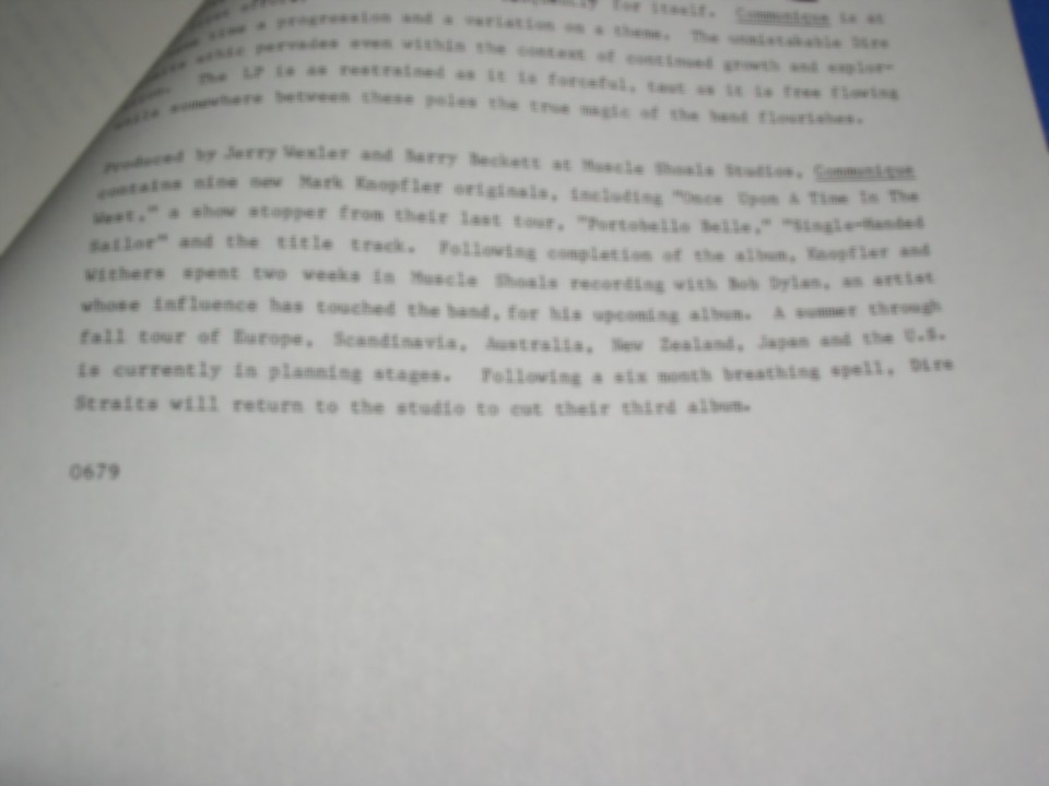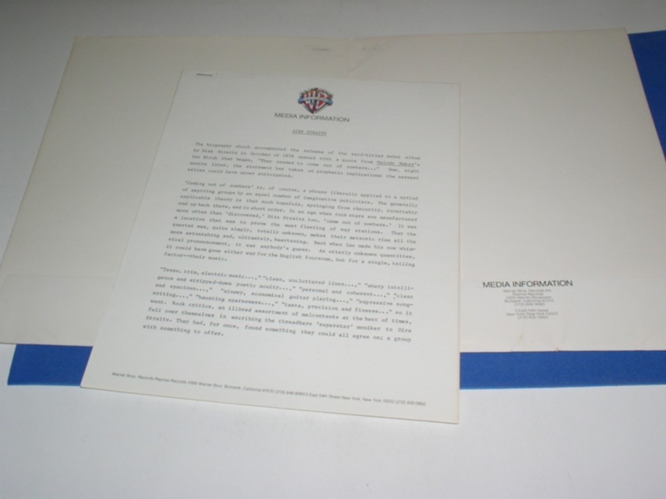 This is a vintage Dire Straits press release with Warner Brothers folder. A 4 page bio. A terrific item for the fan or collector. Intentionally blurred for obvious reasons.