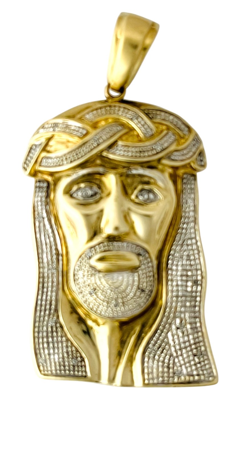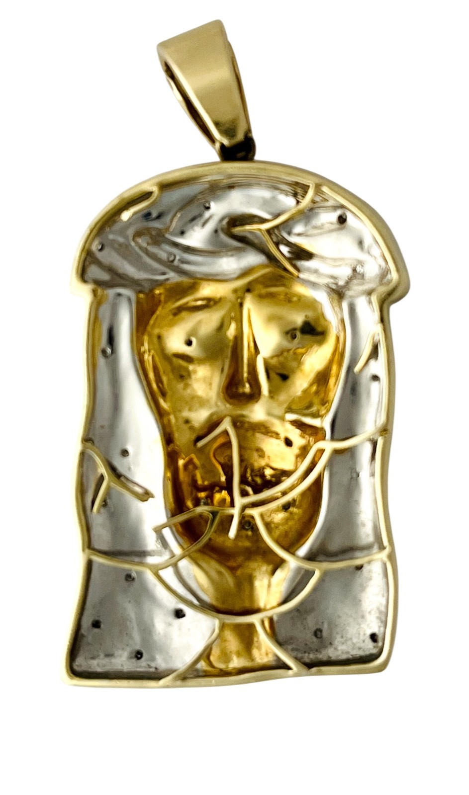 Type: CharmWeight: 9.0Karat: 10ktMetal: Yellow and White GoldGender: UnisexStyle: ReligiousSize / Length: 2.5"Owner applied: NaStone 1 quantity: 9Stone 1 shape: RoundStone 1 color: ClearStone 1 weight (total): .10Stone 1 type: DiamondCondition:Used