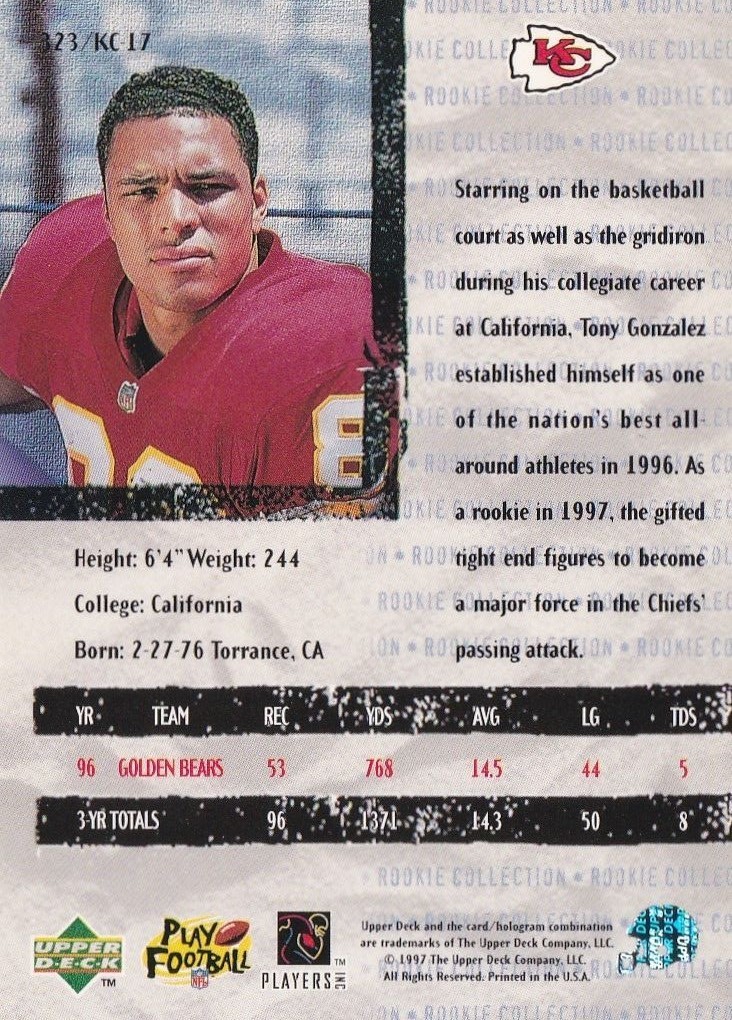 1997 Upper Deck Tony Gonzalez Football Trading Card #323 Kansas City Chiefs