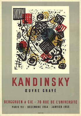 Sku: CB6317Artist: Wassily KandinskyTitle: Engraved WorkYear: 1954Signed: NoMedium: LithographPaper Size: 25.5 x 17.5 inches ( 65 x 44 cm )Image Size: 15 x 12.5 inches ( 38 x 32 cm )Edition Size: UnknownFramed: NoCondition: A-: Near Mint, very light signs of handlingAdditional Details: This is a poster for the Kandinsky exhibition titled "Engraved Work," lithographed and printed by Mourlot in 1954. The exhibition celebrated Wassily Kandinsky's contributions to printmaking and his exploration of abstract art through various engraving techniques. Kandinsky, a key figure in the development of abstract art, used vibrant colors and geometric shapes to express complex emotions and ideas. The poster likely reflects these elements, showcasing his innovative approach to art.