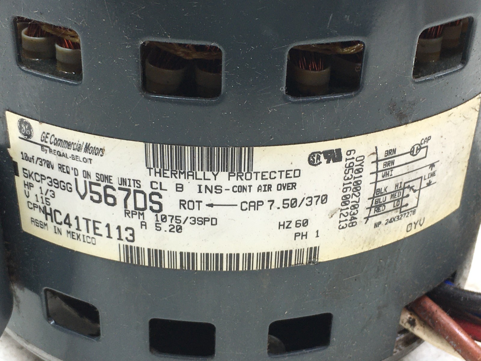 This is GE Motors 5KCP39GGV567DS Blower Motor 1/3HP 1075RPM 3SPD 115V HC41TE113 used part.