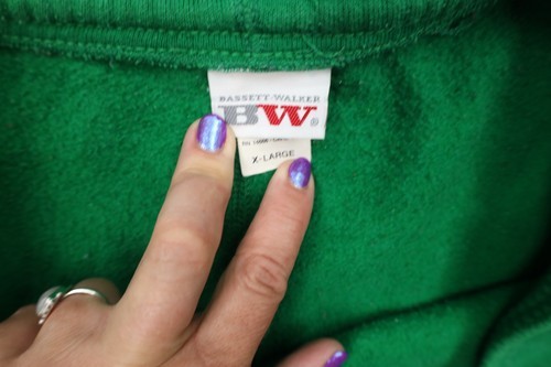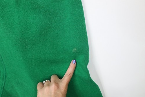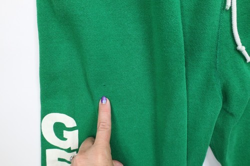Hole front right leg. Has pilling and color fade. Blemish on back. USA made