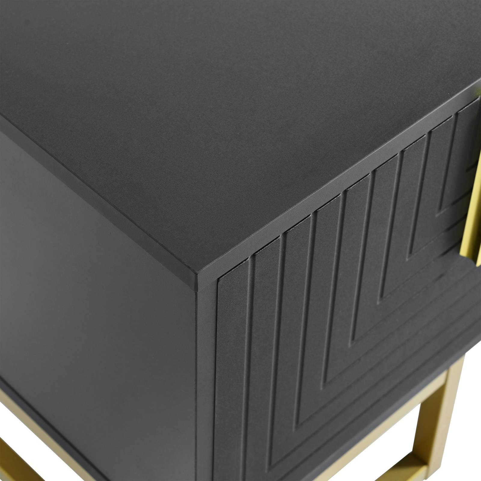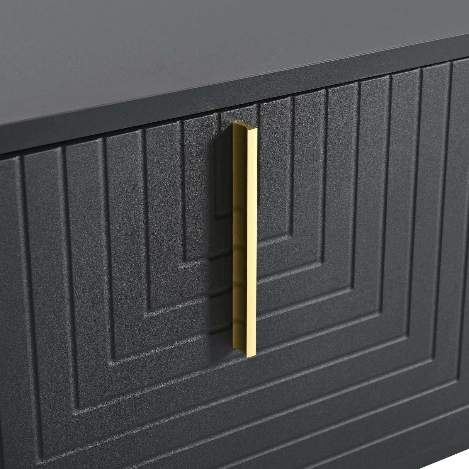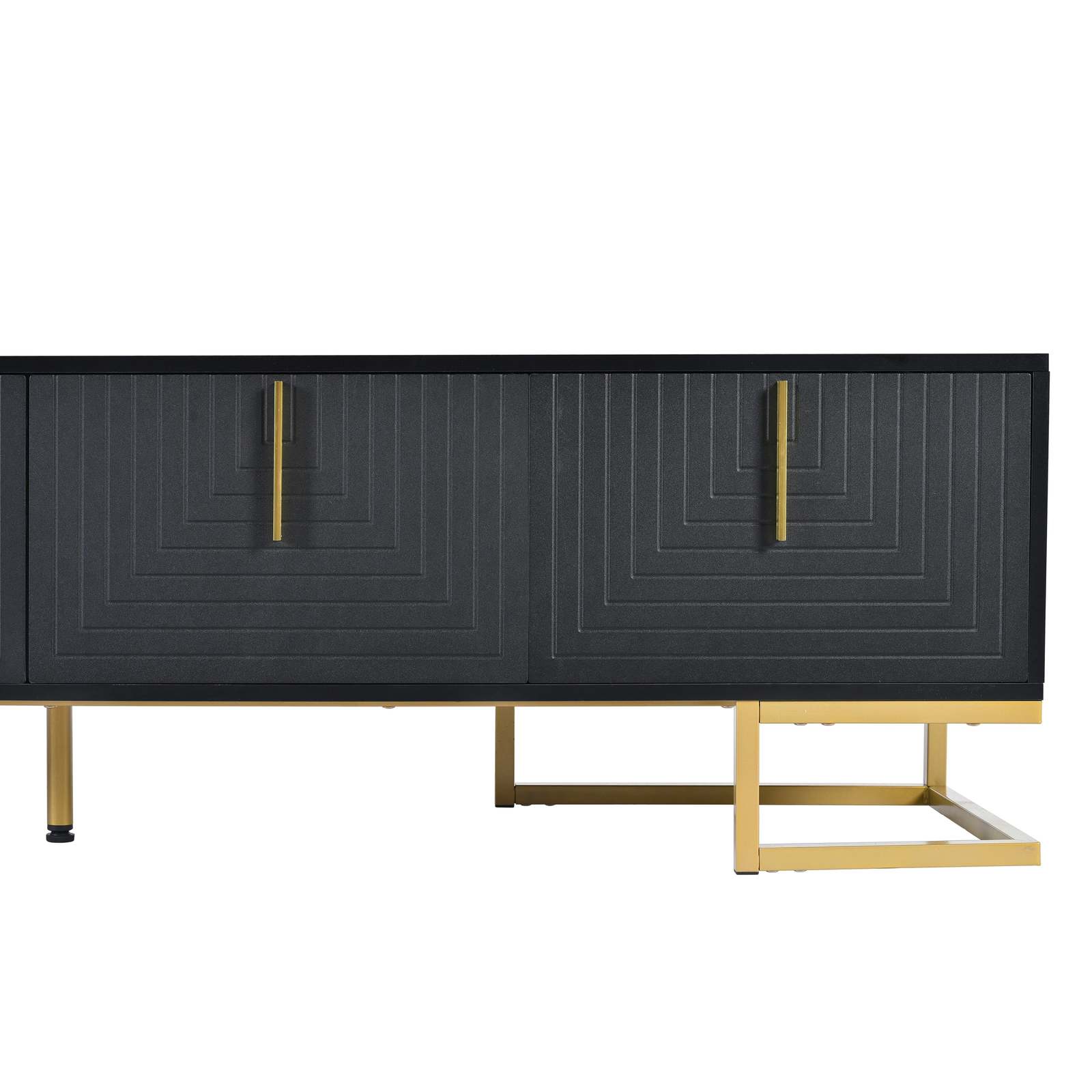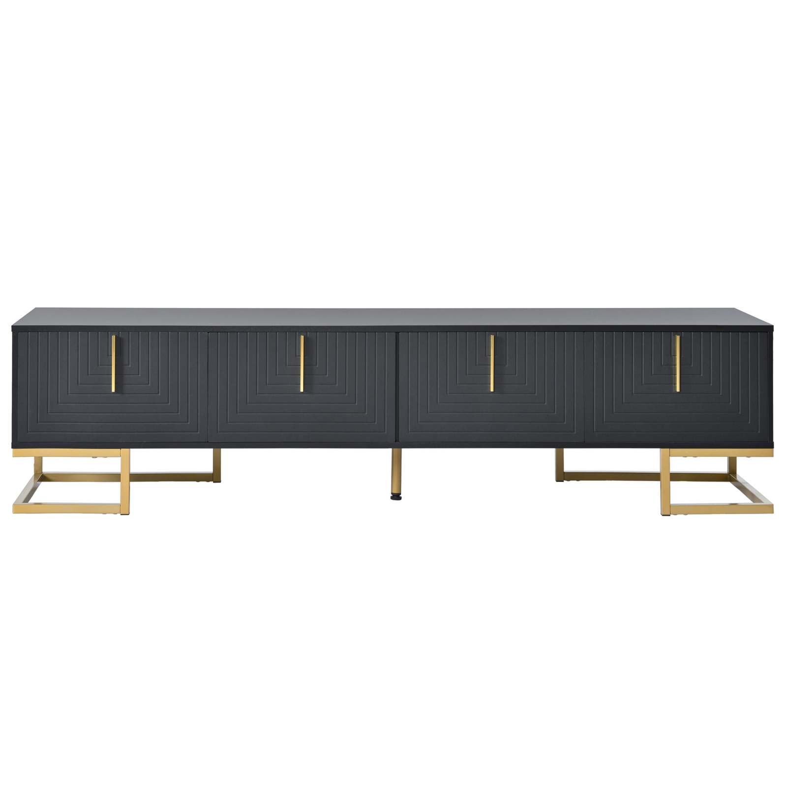 The TV cabinet has four doors, which are decorated with geometric line patterns, creating a unique modern visual experience. Meanwhile, the combination of gold handles and legs also adds a luxurious and upscale feeling to this cabinet.