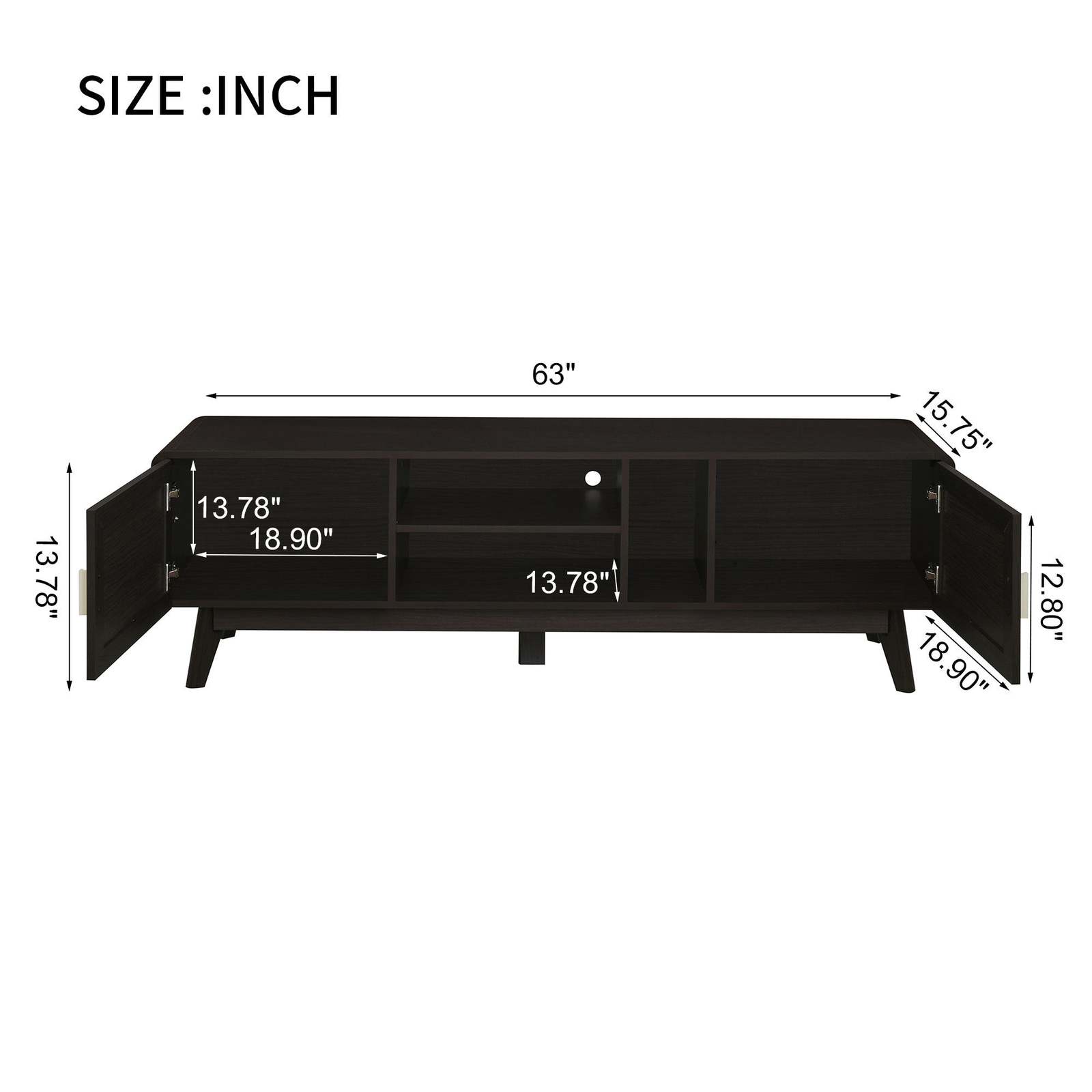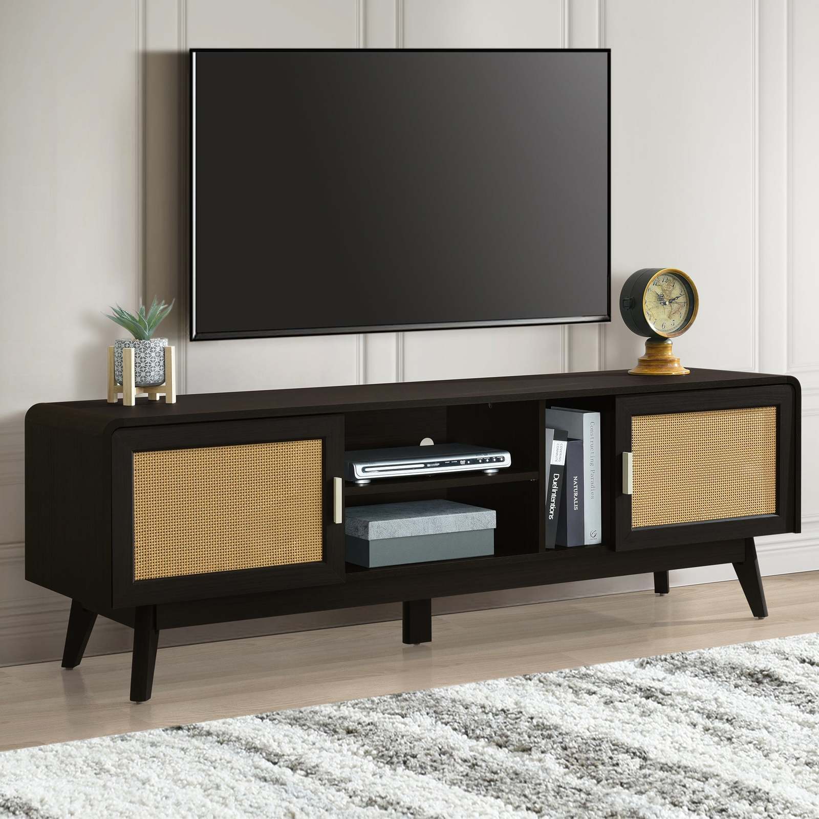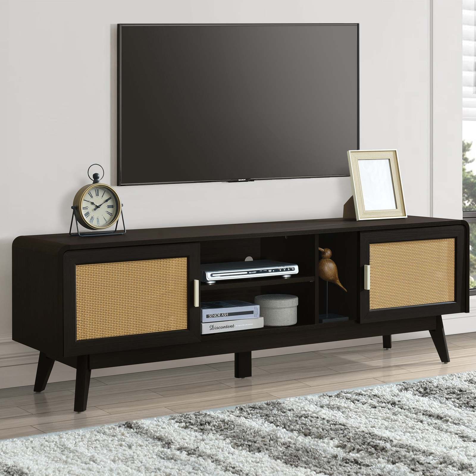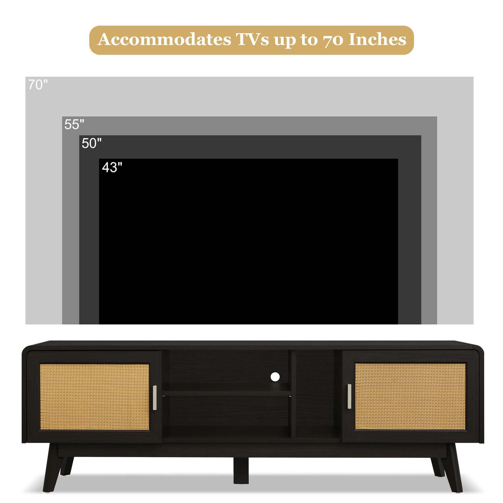 63'' Dark Rattan TV Stand, 65'' TV Entertainment Center, Storage & Legs