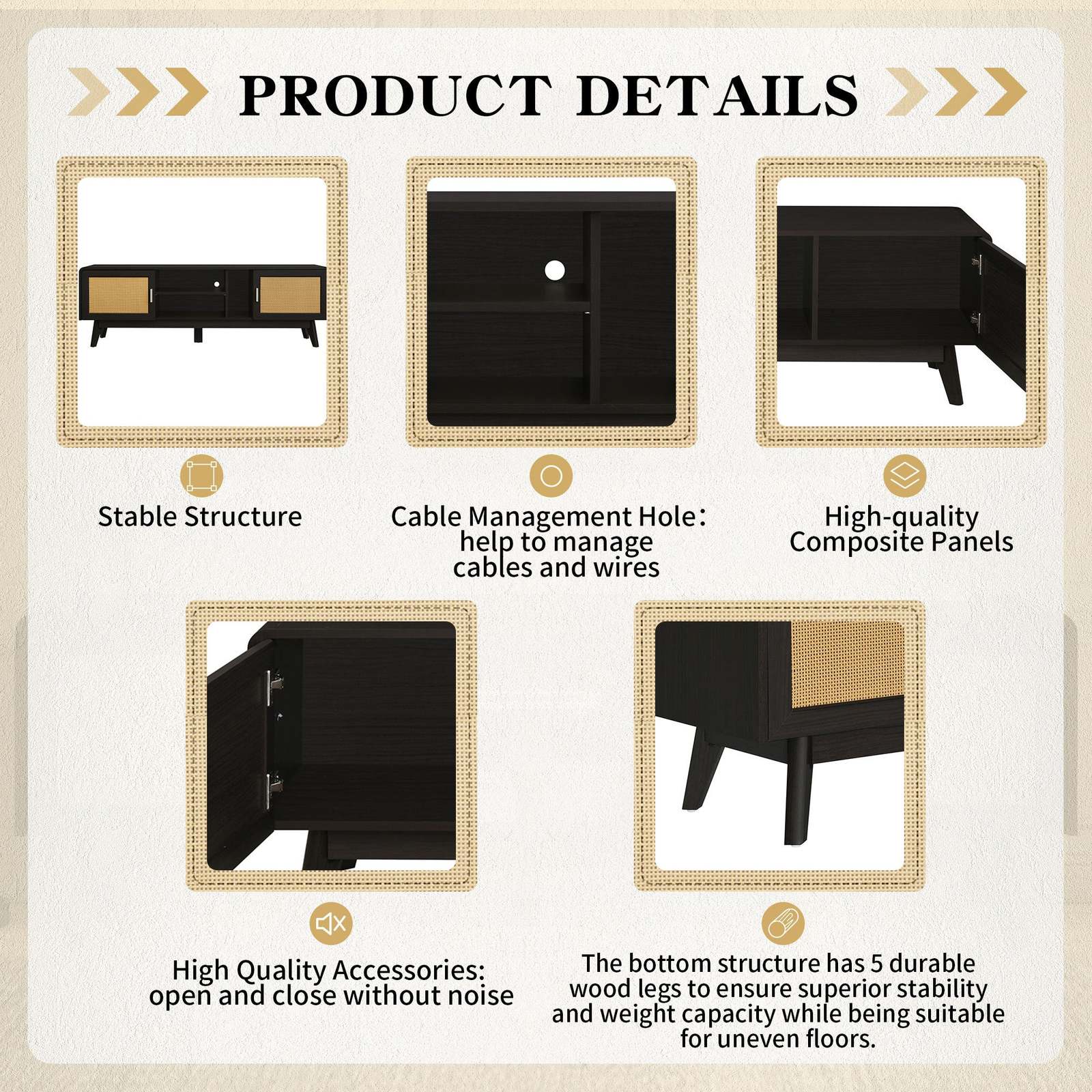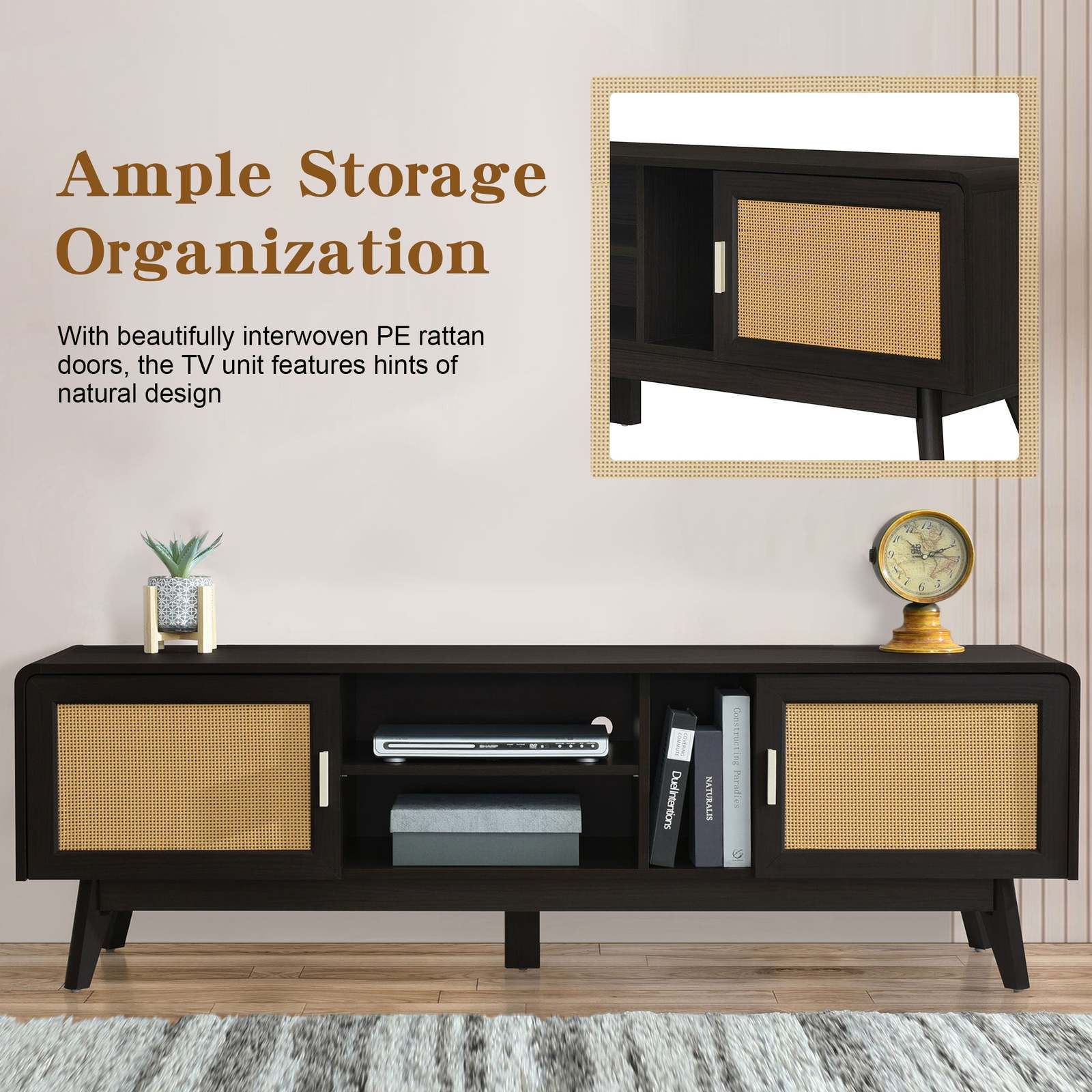 [Bohemian Style Rattan TV Stand] The harmonious blend of dark wood grain and faux rattan weave can easily enhance the elegance of your room. The addition of stylish metal element handles brings a modern aesthetic to your bedroom or living room.