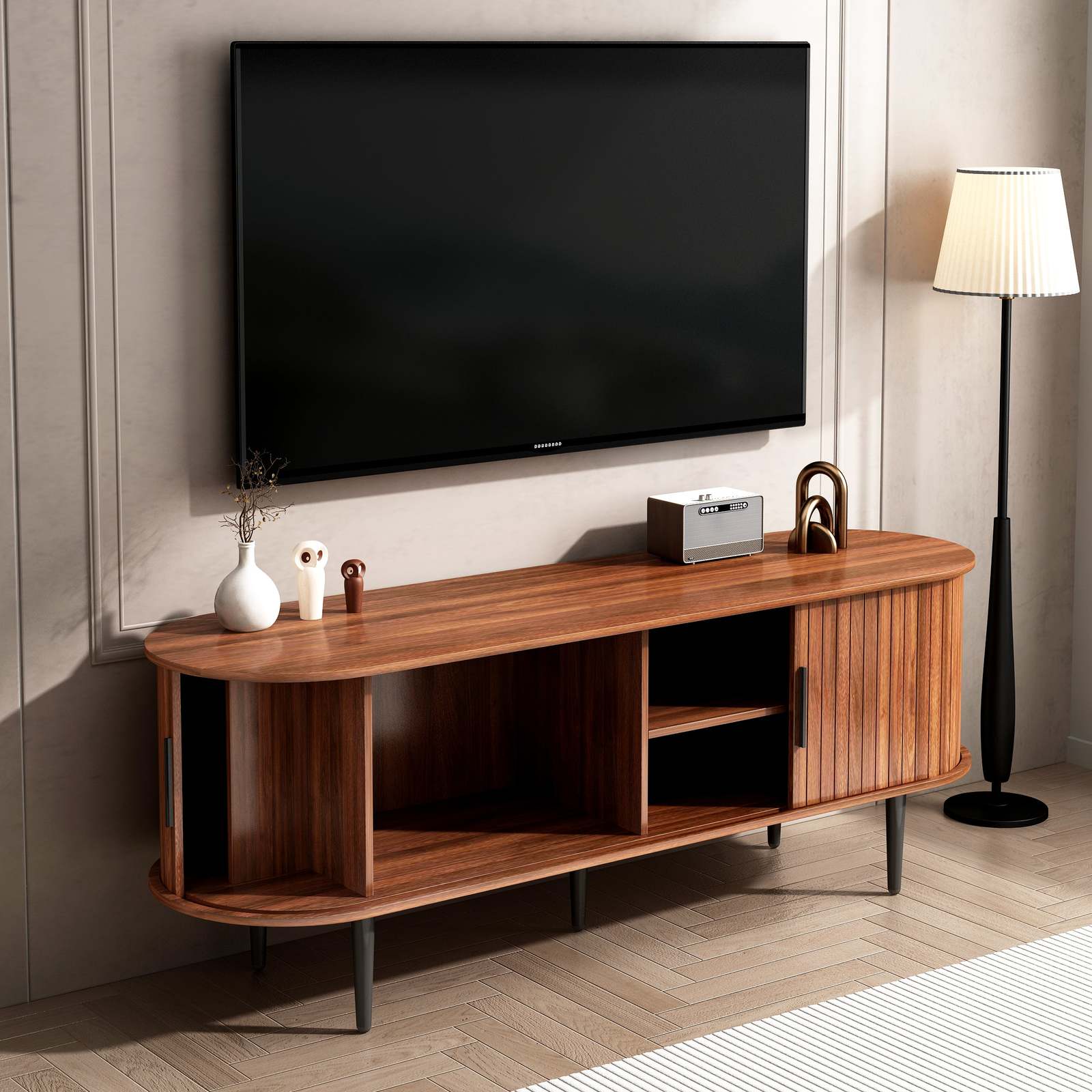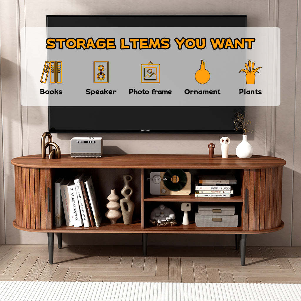 ?Mid-Century Modern Style? This stylish media console table instantly upgrades any home decor style with its fluted details, a curved silhouette, and wood grain. The simple and elegant design perfectly matches various furniture styles. It is not only a TV stand, but also can be used as a storage cabinet. It is perfect for living room, bedroom, office, etc.