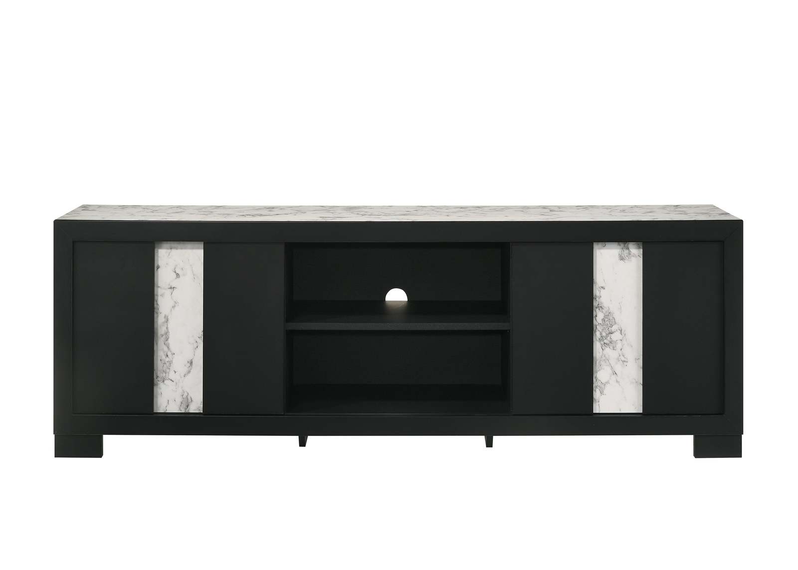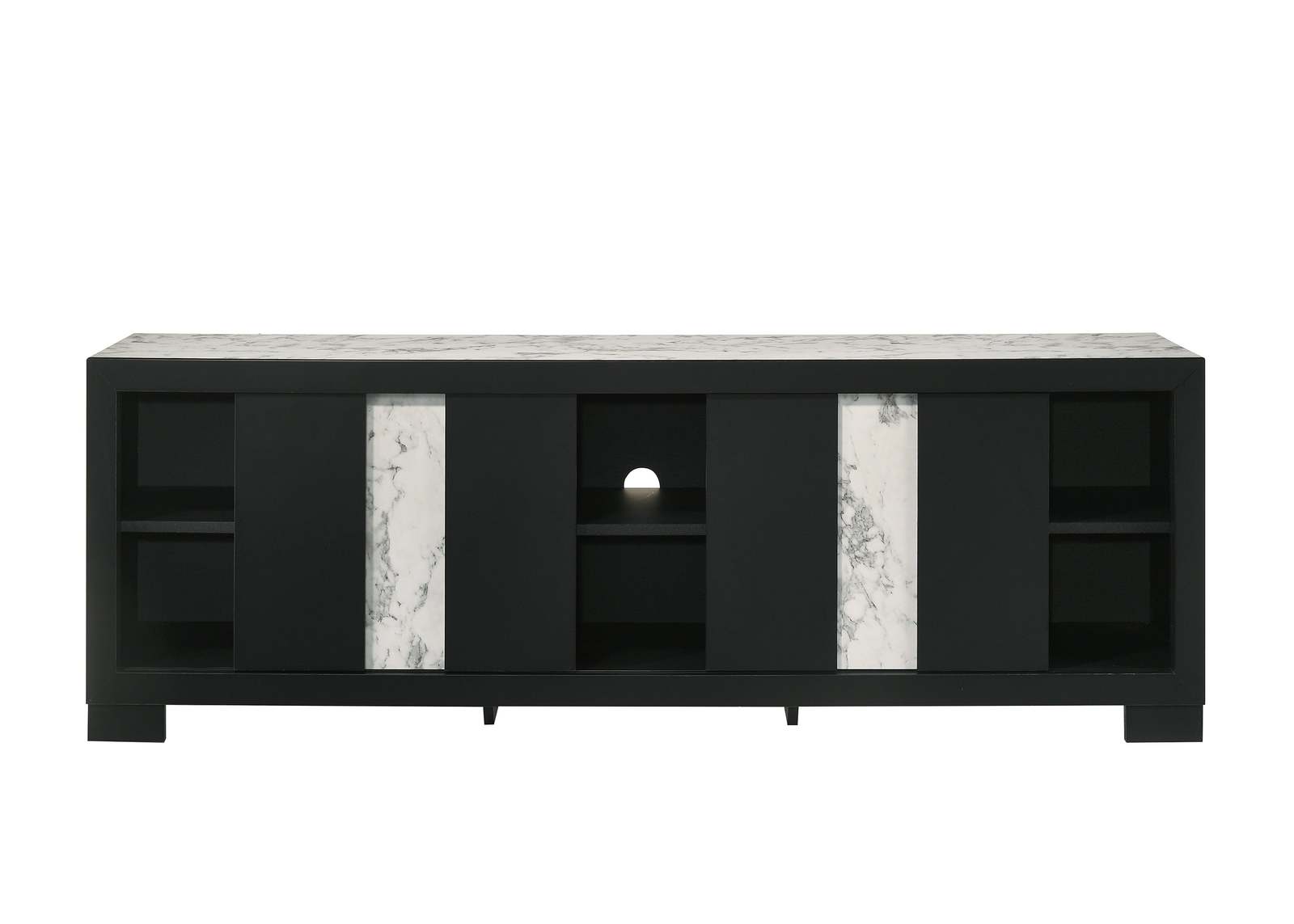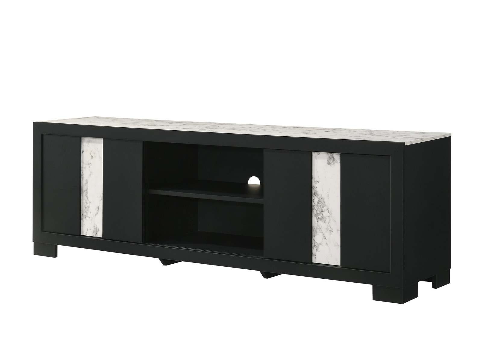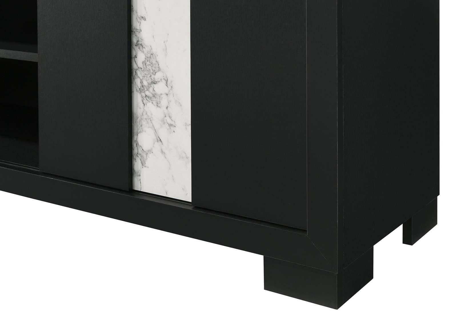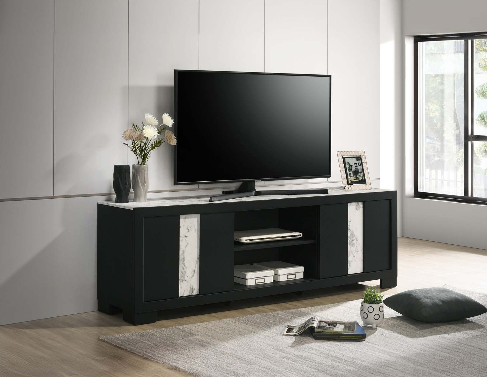 This sleek and modern entertainment unit is the epitome of contemporary elegance and functional design. Boasting a bold black finish with striking marble-like accents, this piece serves as a captivating centerpiece for any living space. Its generous surface perfectly accommodates large screen displays, while the ample storage space including open shelving and discreet cabinets with sliding doors provides a neat solution for all your multimedia devices.
