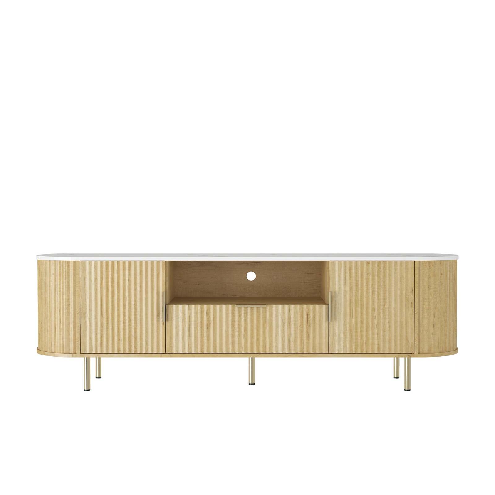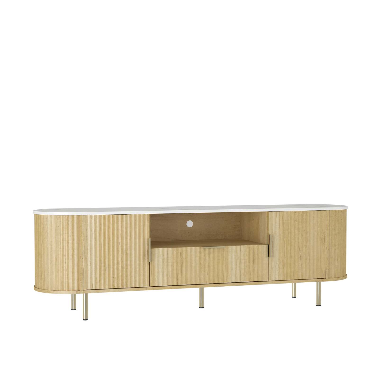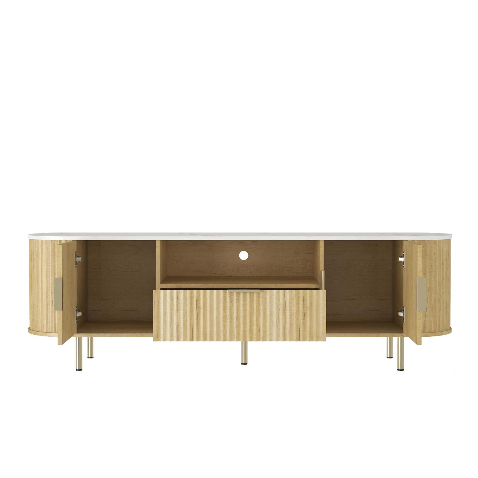 The corners of Entertainment Center TV Cabinet with Drawer are designed with smooth, rounded edges, enhancing safety and convenience by minimizing the risk of accidental bumps during daily use. This design not only improves the safety of the furniture but also enhances the overall aesthetic and comfort of Media Console Table.
