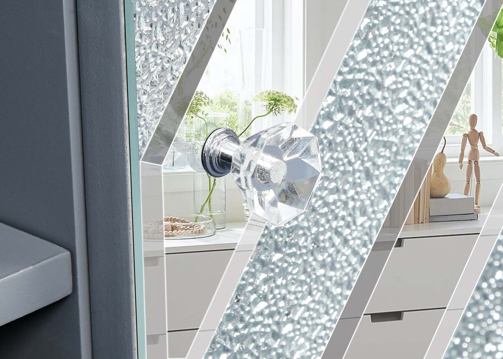 Diamond-Cut Glass Accents: Features dual doors adorned with diamond-patterned glass inserts, blending luxury and subtle privacy with a touch of modern sophistication to complement diverse home decors.