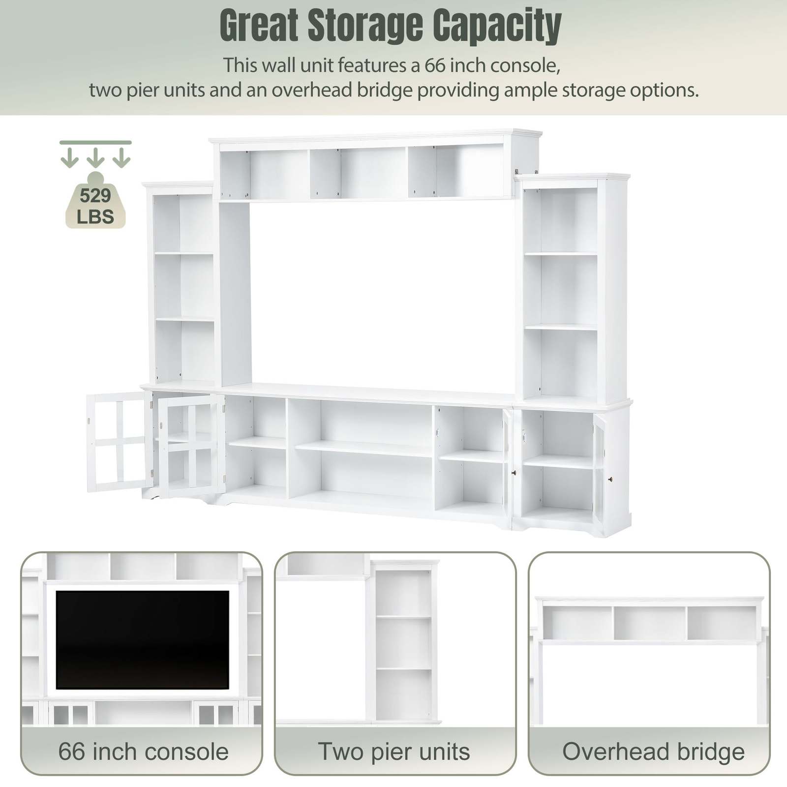 With its great storage capacity, this wall unit offers various storage options with a 66-inch console, two pier units, and an overhead bridge. The spacious storage capabilities make it perfect for housing all of your essential items in an organized and convenient manner.