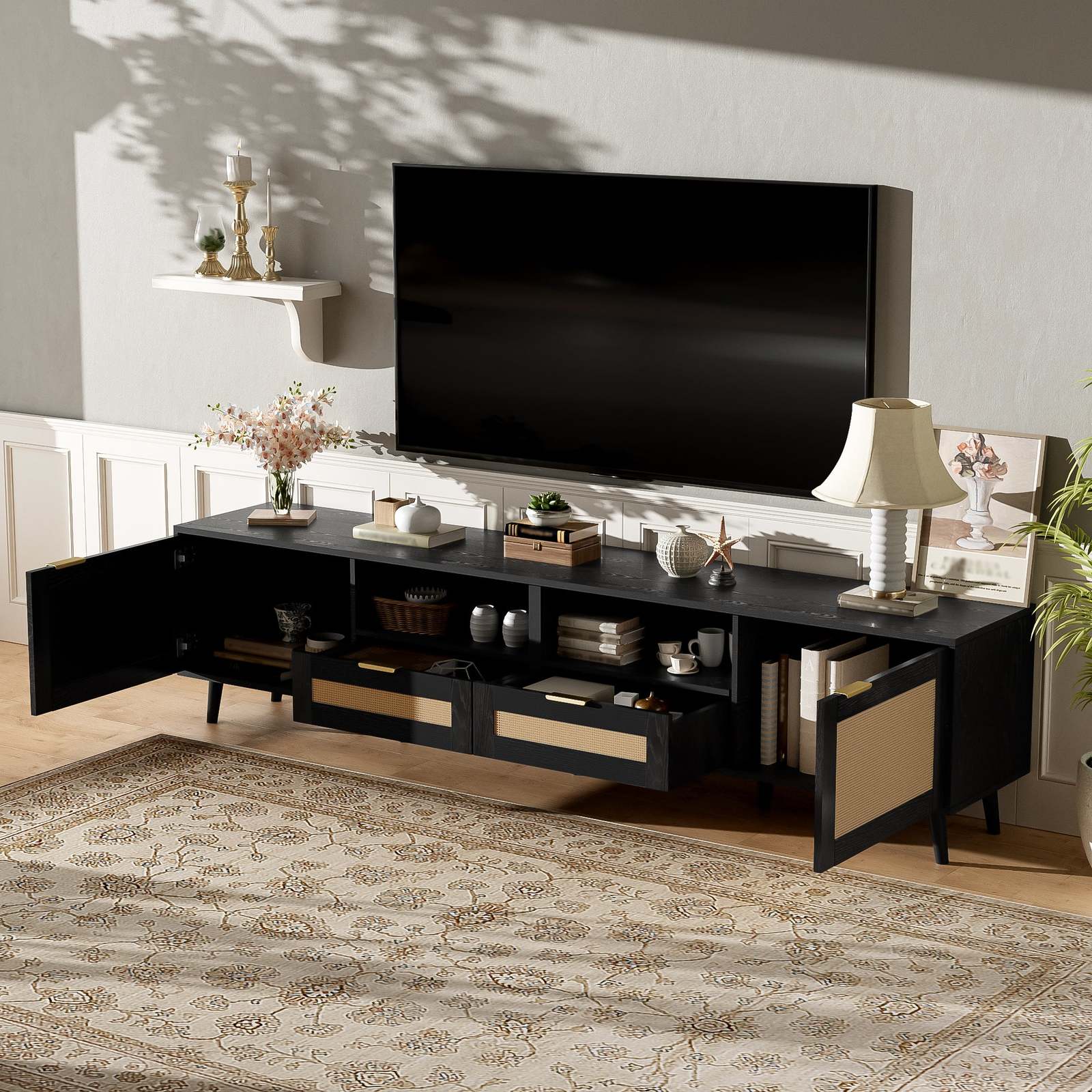[Ample Storage] Our Rattan TV Stand features 2 spacious storage cabinets and two open shelves, providing plenty of space for all your media devices, accessories, and more. Keep your living room organized and clutter-free.