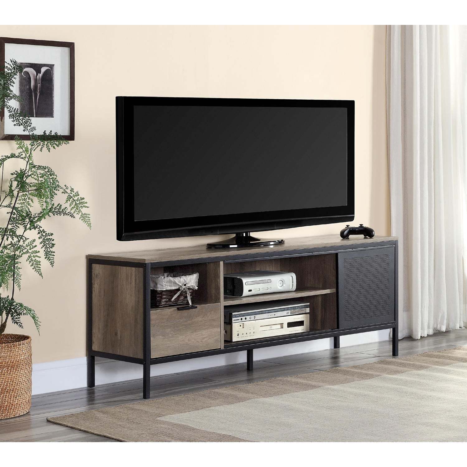 Highlight your entertainment space with a dash of functional, industrial-style. The TV stand pairs rustic wood materials with black-finished metal frame for a rough and bold appearance. The metal sliding door adds extra style and function to this piece. It offers one drawer and four storage compartments to organize all TV accessories in one spot.