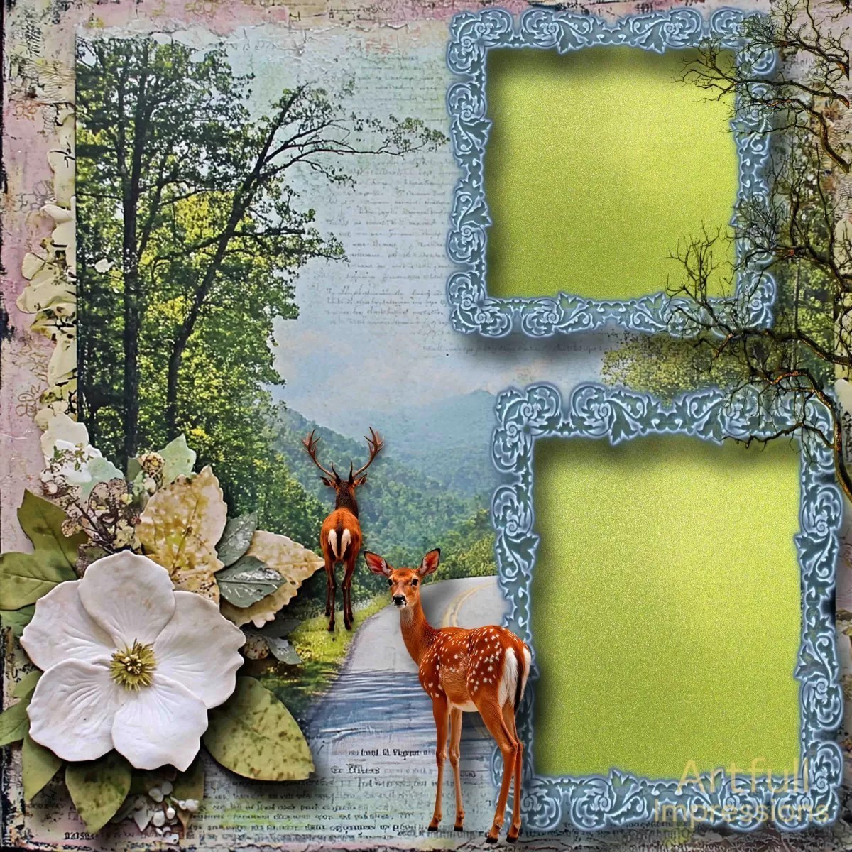 backdrop, elegant wild roses, and two lifelike deer. This layout perfectly