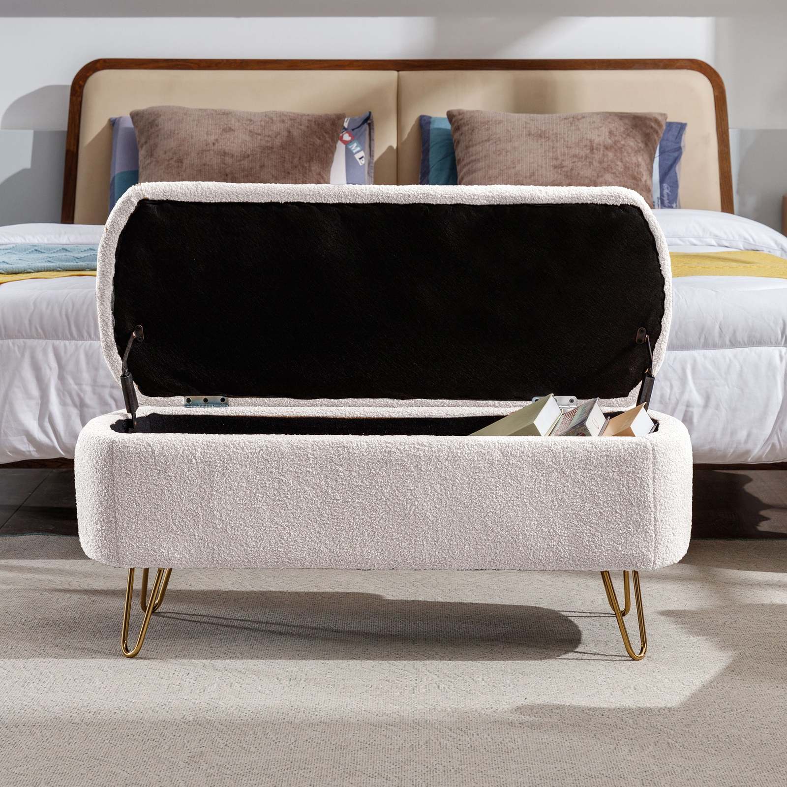 The storage bench can be used for sitting and storage, and can be placed at the end of the bed or next to the shoe cabinet. It has convenient and practical functions, and has a beautiful and lovely appearance.In terms of material, we chose Faux Fur. Faux Fur can make the whole bench look fuller and also increase the comfort of the bench.