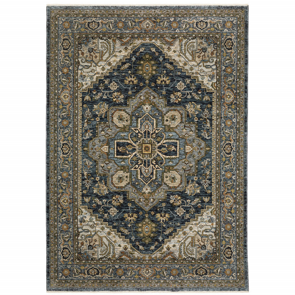 This captivating blend of blue taupe grey green rust tan beige and gold in a classic oriental design isn't just attractive - it's a conversation starter. The intricate details will draw you in like a map leading to a hidden treasure. You'll find yourself captivated by the timeless charm, yearning for that feeling of wanderlust and connection through art.