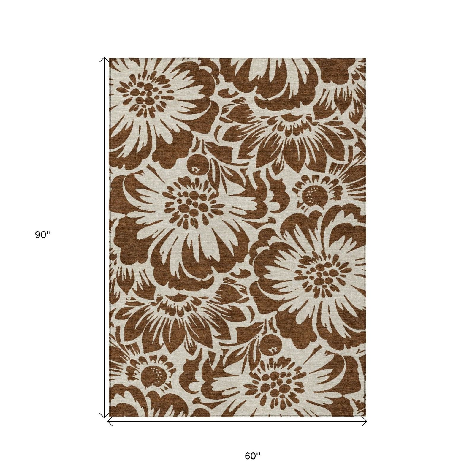 5' X 8' Brown and Ivory Floral Washable Non Skid Indoor Outdoor Area Rug