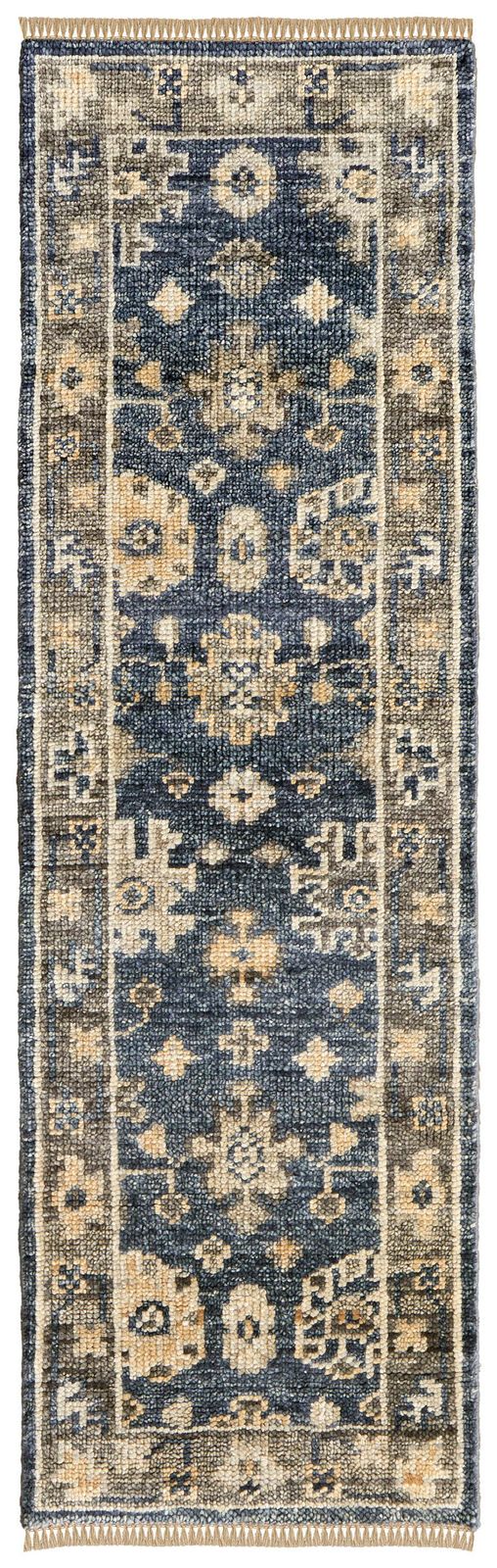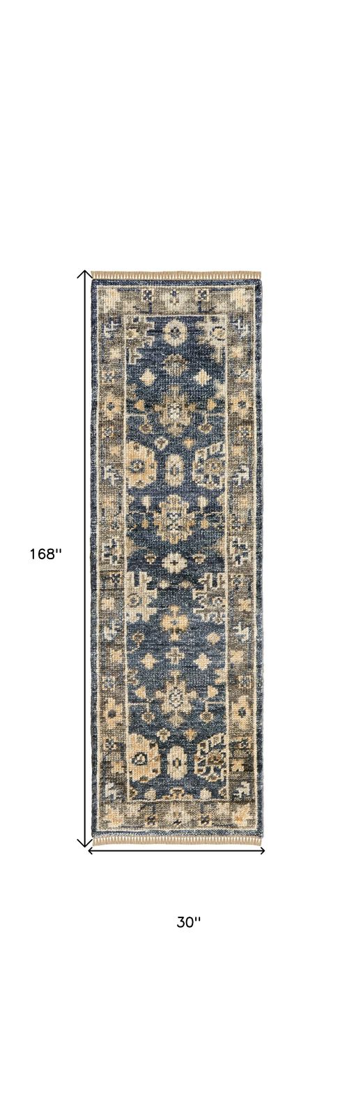Add some artistry to your room with this 14-foot blue and gray wool floral hand knotted runner rug with fringe. This runner shaped rug features a floral design in blue and gray to give it visual interest. A classic shape marries with good looking design for your space ideal for spaces with kids and pets, this rug is stain resistant to help repel stains and spilled liquids. Tassel ends bring a timeless and fashionable look to your interior. Crafted by skilled artisans, this hand knotted rug is genuine and unique. No two will be exactly alike. Place this area rug against a hardwood or tile floor and it will enliven your living space with style and sophistication. 30-inch H x 168-inch W x 0.4-inch D