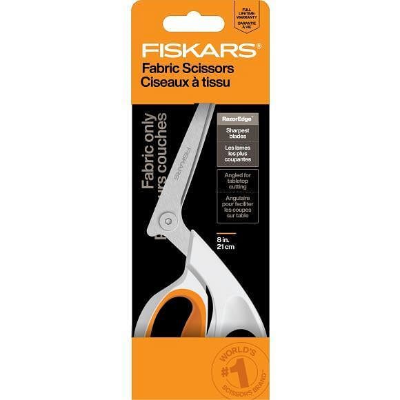Perfect for a wide range of sewing and quilting tasks, Fiskars 8 in. RazorEdge Fabric Shears for Tabletop Cutting feature premium-grade, stainless steel RazorEdge blades, precision-honed to an ultra-sharp edge to ensure every cut is crisp and clean. A unique handle design helps keep fabric flat on the table while you cut for error-free cutting precision, while sculpted finger and thumb loops provide excellent comfort and control. An advanced pivot design provides ultra-smooth cutting action, and an included sheath helps protect the blades when not in use.