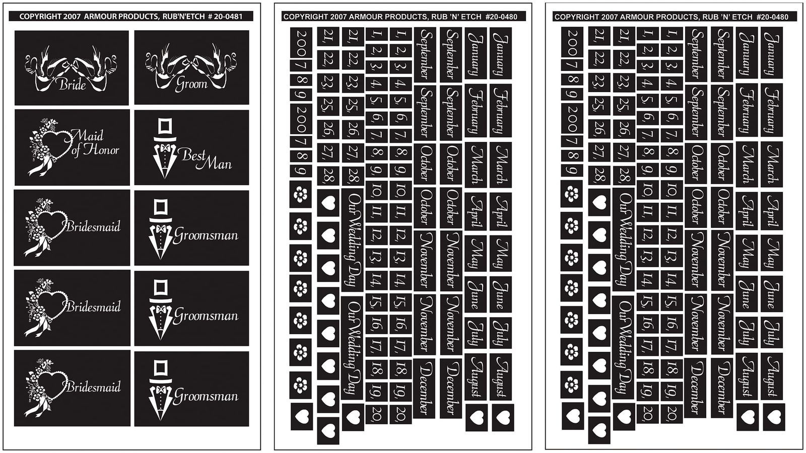 Armour-Rub 'n Etch Glass Etching Stencil. These small and detailed rub-on stencils were Designed for small glass etching projects such as stemware, table mirrors, cabinet doors, sun catchers, bottles and jars. When you combine these pre-cut, Rub N Etch stencils with Etch Glass Etching Cream (not included) you create the easiest, fun-filled way to create beautiful etched designs to permanently decorate and personalize your household glassware, windows and mirrors. Each Rub N Etch stencil sheet was design for one use only. This package contains three 5x8in sheets, illustrated instructions and wood applicator stick. Available in a wide variety of designs. Made in USA.