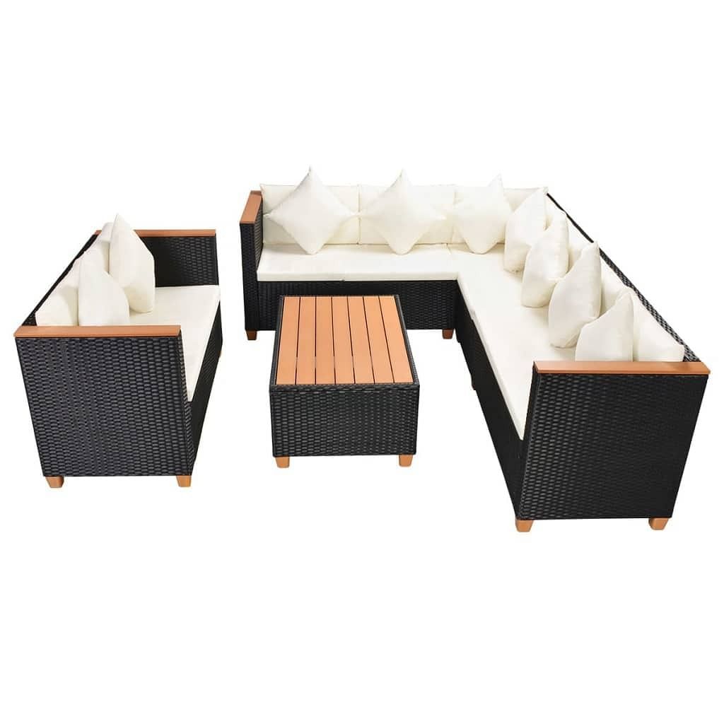 This large 5-piece garden lounge set not only offers enough seating for up to six guests but also does it with style and comfort. With a modern look in mind, the set features a mix of sleek black synthetic poly rattan and strong powder-coated steel, giving it a contemporary vibe suitable for any outdoor space, from patios to gardens.