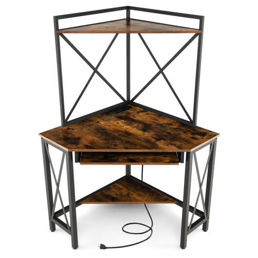 Space-Saving Corner Computer Desk with with Hutch and Keyboard Tray-Rust Brown -