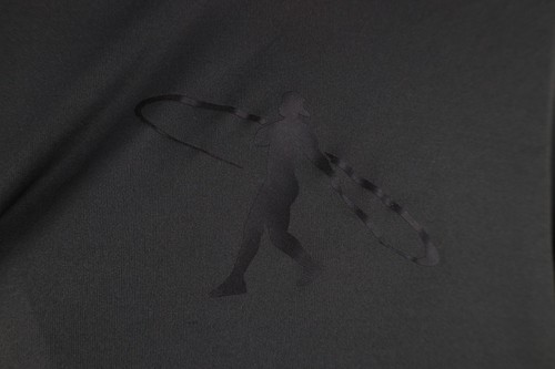 Dark spots, fabric pulls. Collar, cuffs discolored. Graphics faded