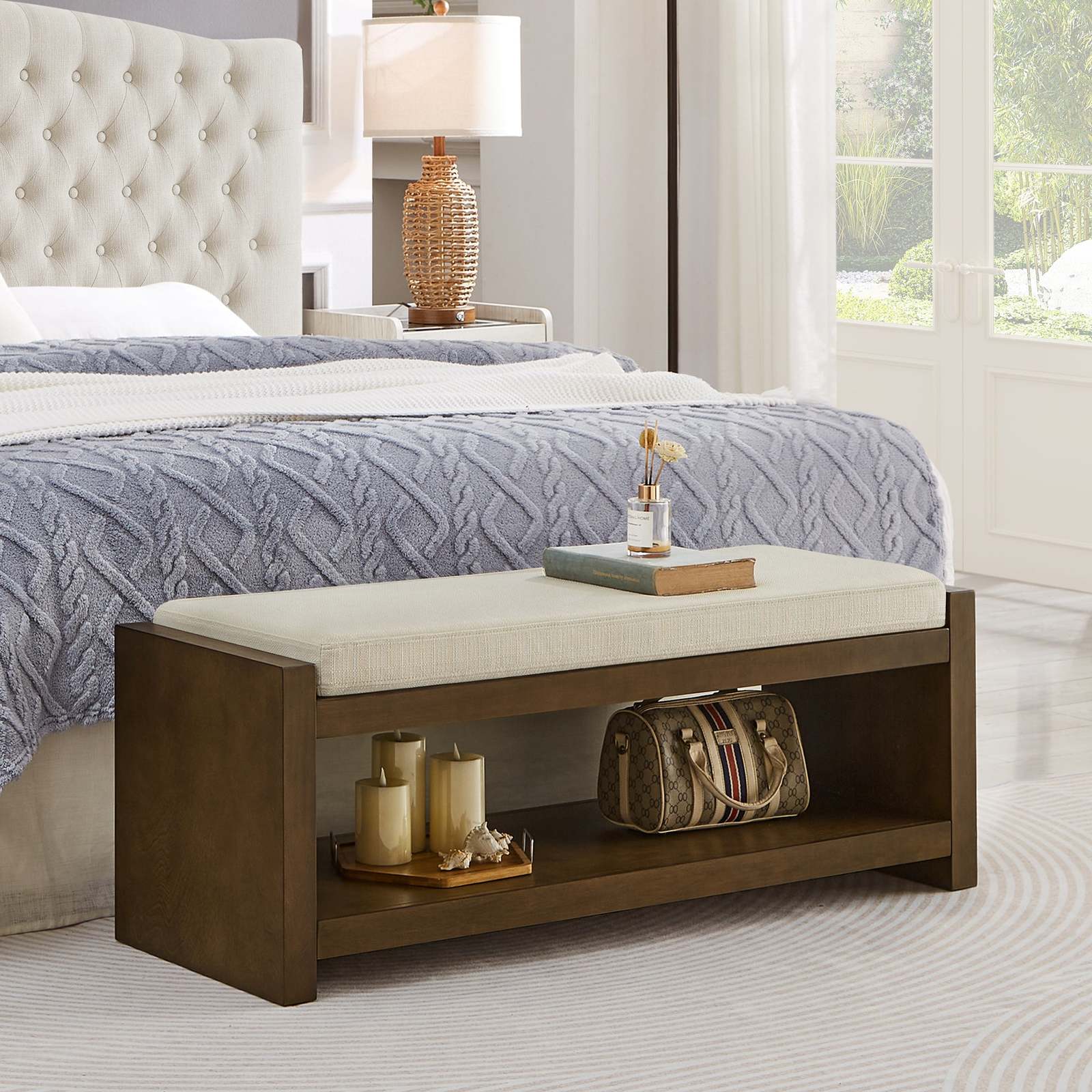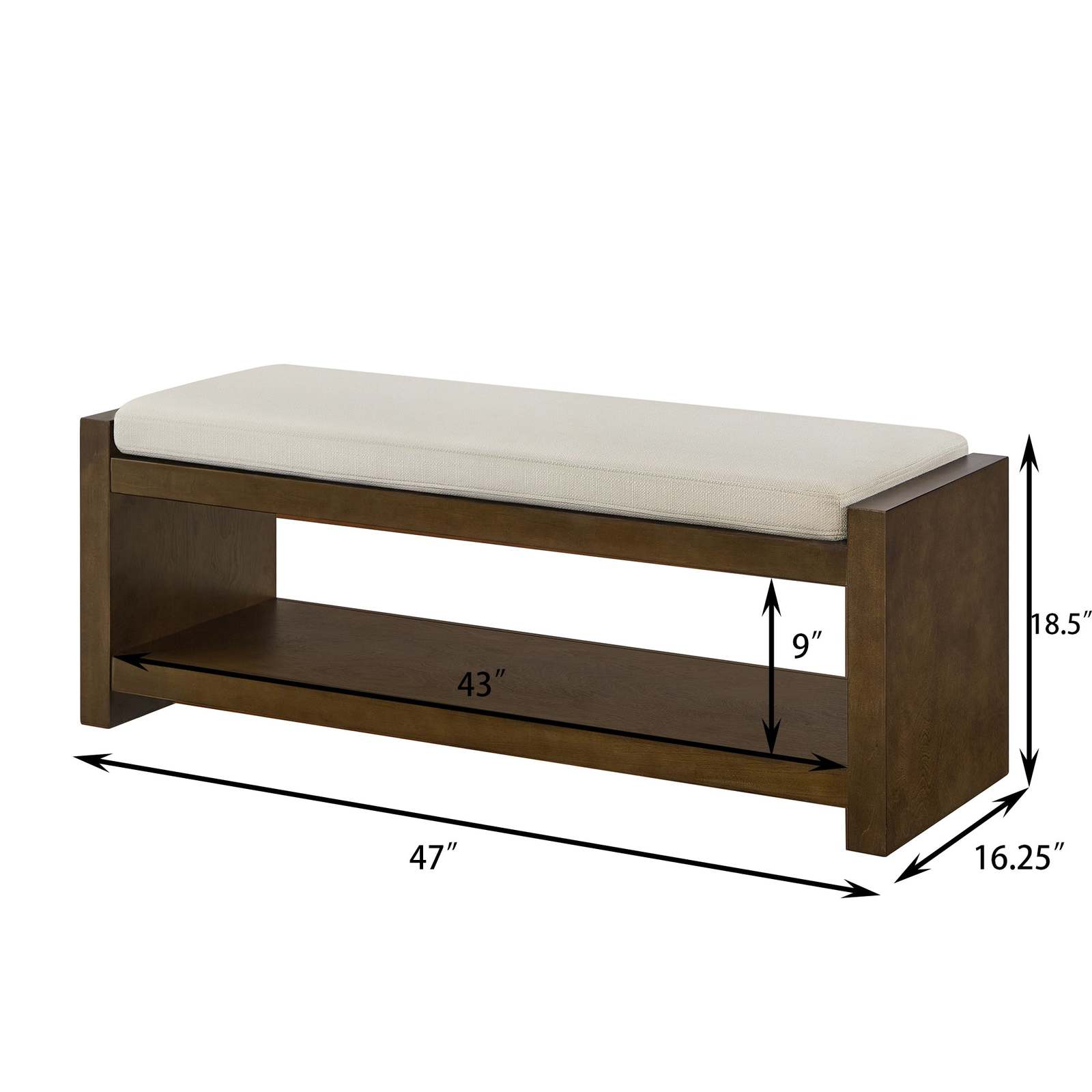 Transitional design bench, blending style and functionality. Equipped with lower shelf for shoes storage, it's perfect for any entryway. The raised sides keep the cushion secure, and the removable upholstered cushion adds both comfort and practicality