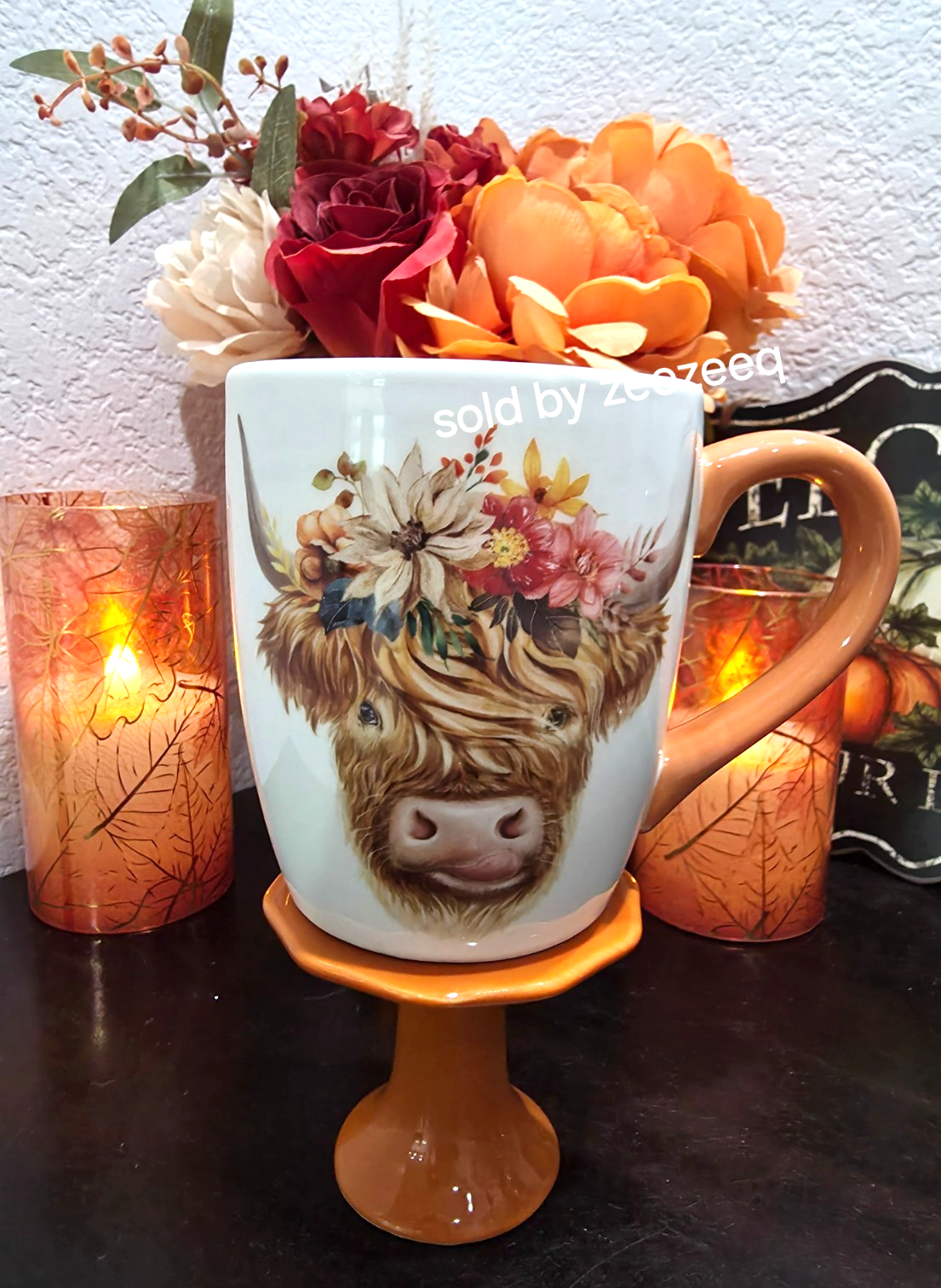 Up for sale we have this adorable Fall/Thanksgiving coffee mug for your kitchen decor. The mug has a Highland cow with a floral crown and inside of the mug is orange. Mug is one sided. New