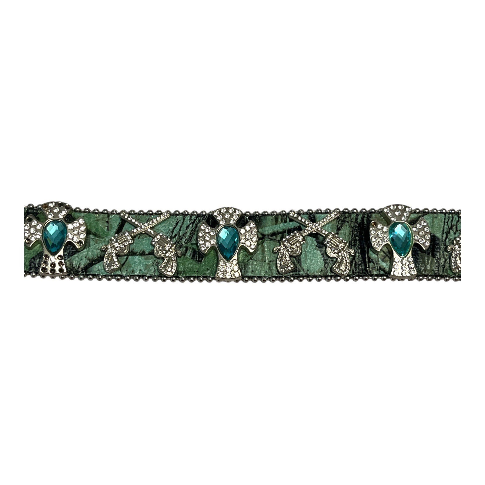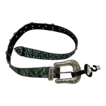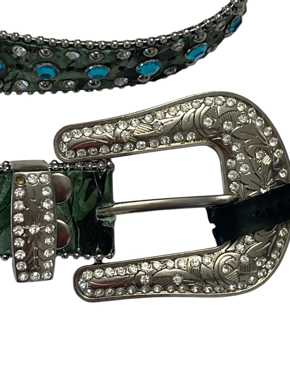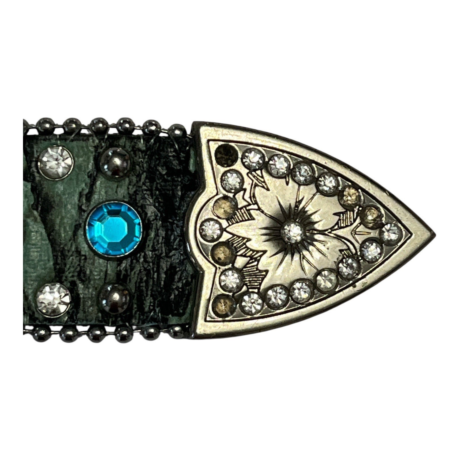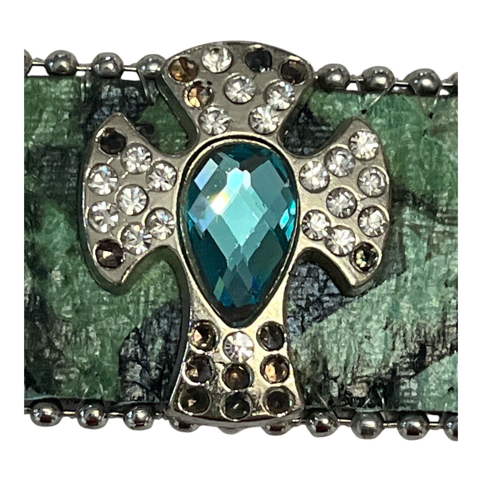 Add western flair to your wardrobe with this eye-catching genuine leather belt featuring turquoise rhinestone cross conchos and sparkling details. The strap has a green and black textured finish with silver beaded edging, and the oversized silver-tone buckle, tip, and keeper are engraved and encrusted with clear crystals.