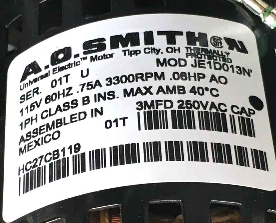 This is A.O.SMITH JE1D013N Carrier Bryant Draft Inducer Blower HC27CB119 115V 3300 RPM used part.