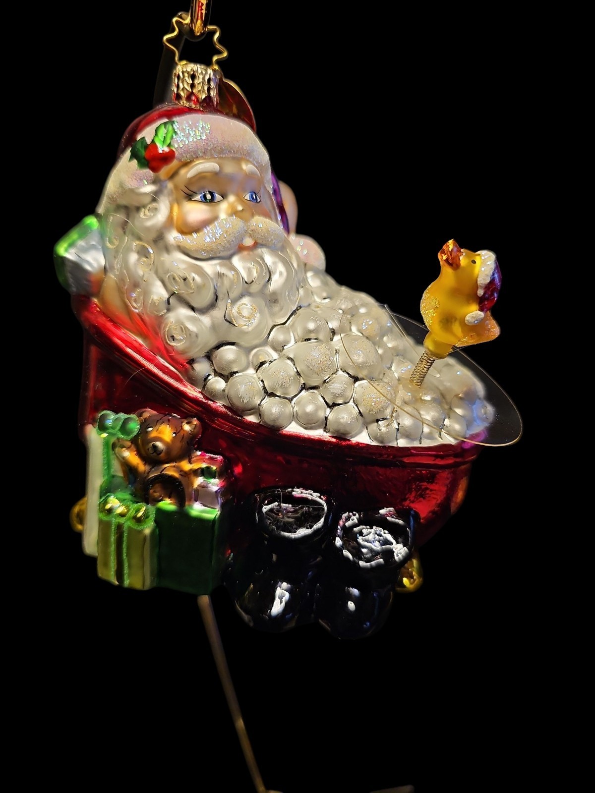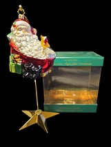 Christopher Radko 2002 handblown glass ornament featuring Santa in a sleigh with pearl detailing and toys. Made exclusively for Bath Body Works. Original box and hangtag included. No chips or cracks. Retired and collectible.