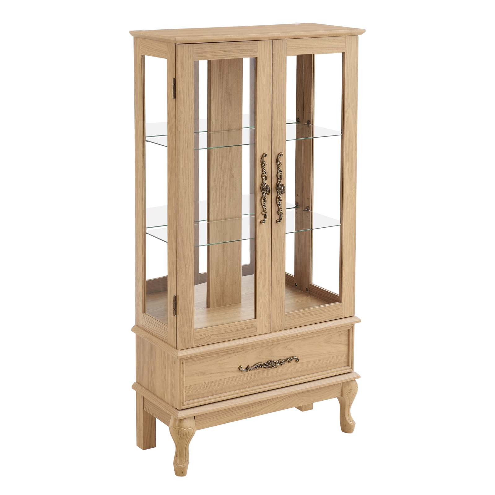Lighted Glass Curio Display Cabinet, Adjustable Shelves, Light Oak