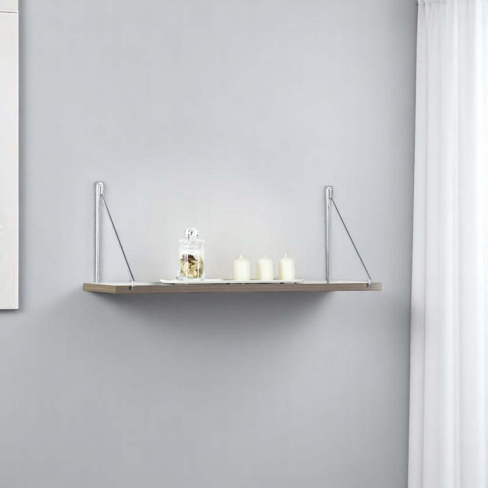 Clean and modern design with chrome metal brackets. Sturdy wooden shelf with a smooth, natural finish. Perfect for displaying small decorative items. Space-saving wall-mounted structure. Easy to install and versatile for any room