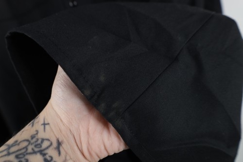 Stain right arm. Blemishes front, left side, back. Collar, cuffs discolored. Loose threads cuffs, buttons. Color faded. Made in USA