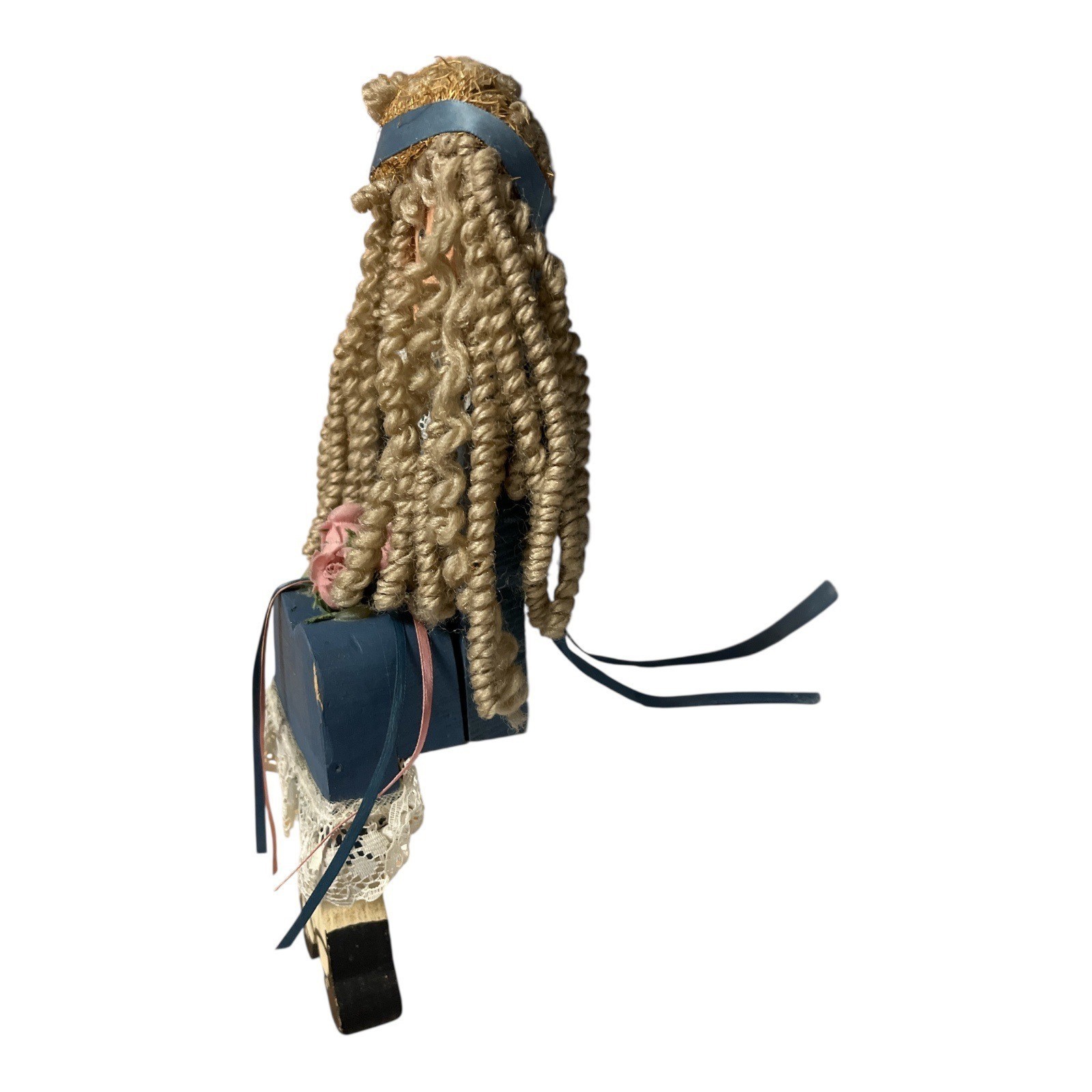 Charming vintage handmade wooden shelf sitter doll with painted features, long blonde yarn curls, and a blue ribbon headband. She wears a blue dress trimmed with white lace and holds a small bouquet of pink fabric roses. Painted shoes and stockings complete her folk art look. Legs dangle over the edge when seated, perfect for a shelf or mantel display.