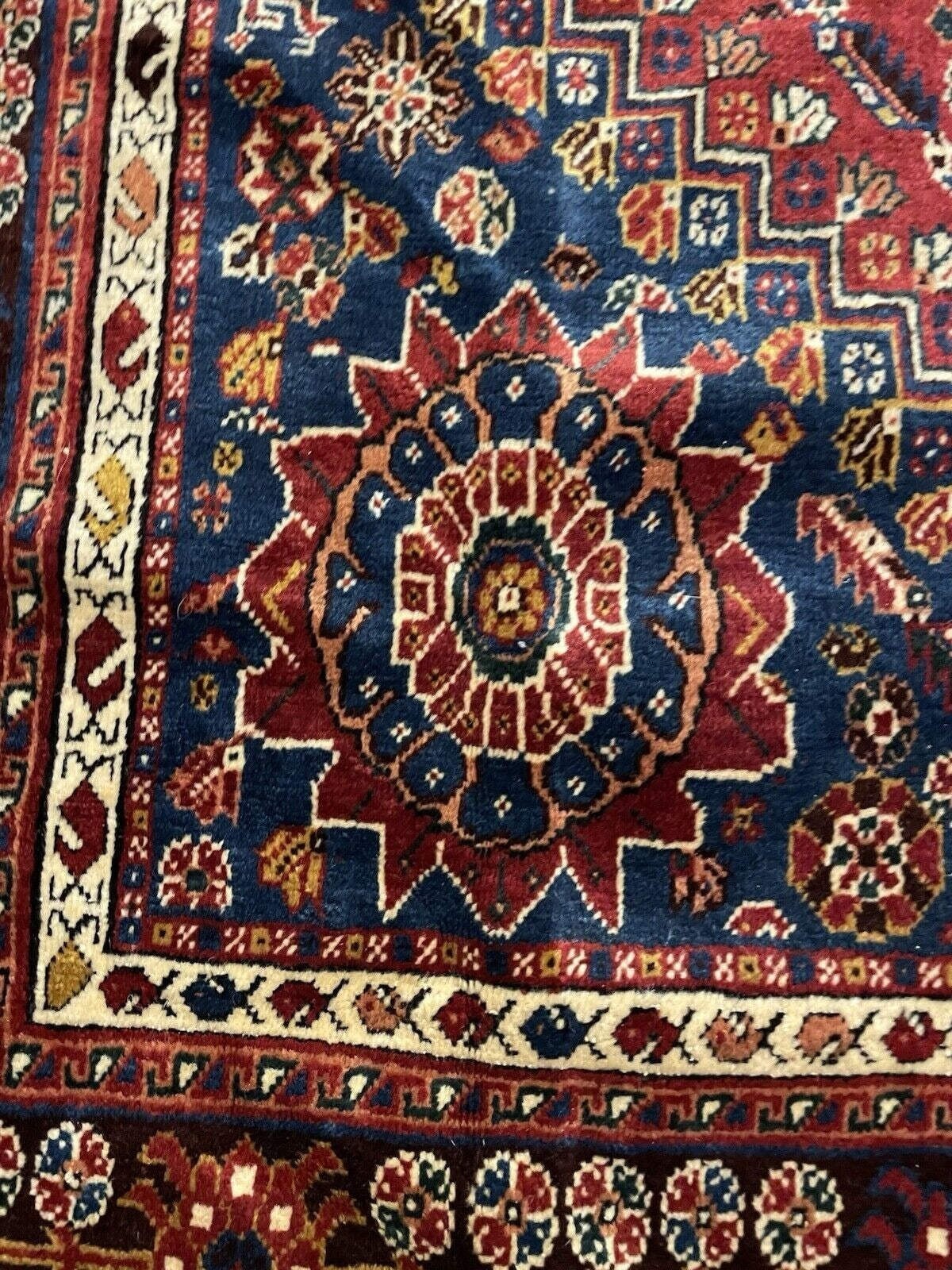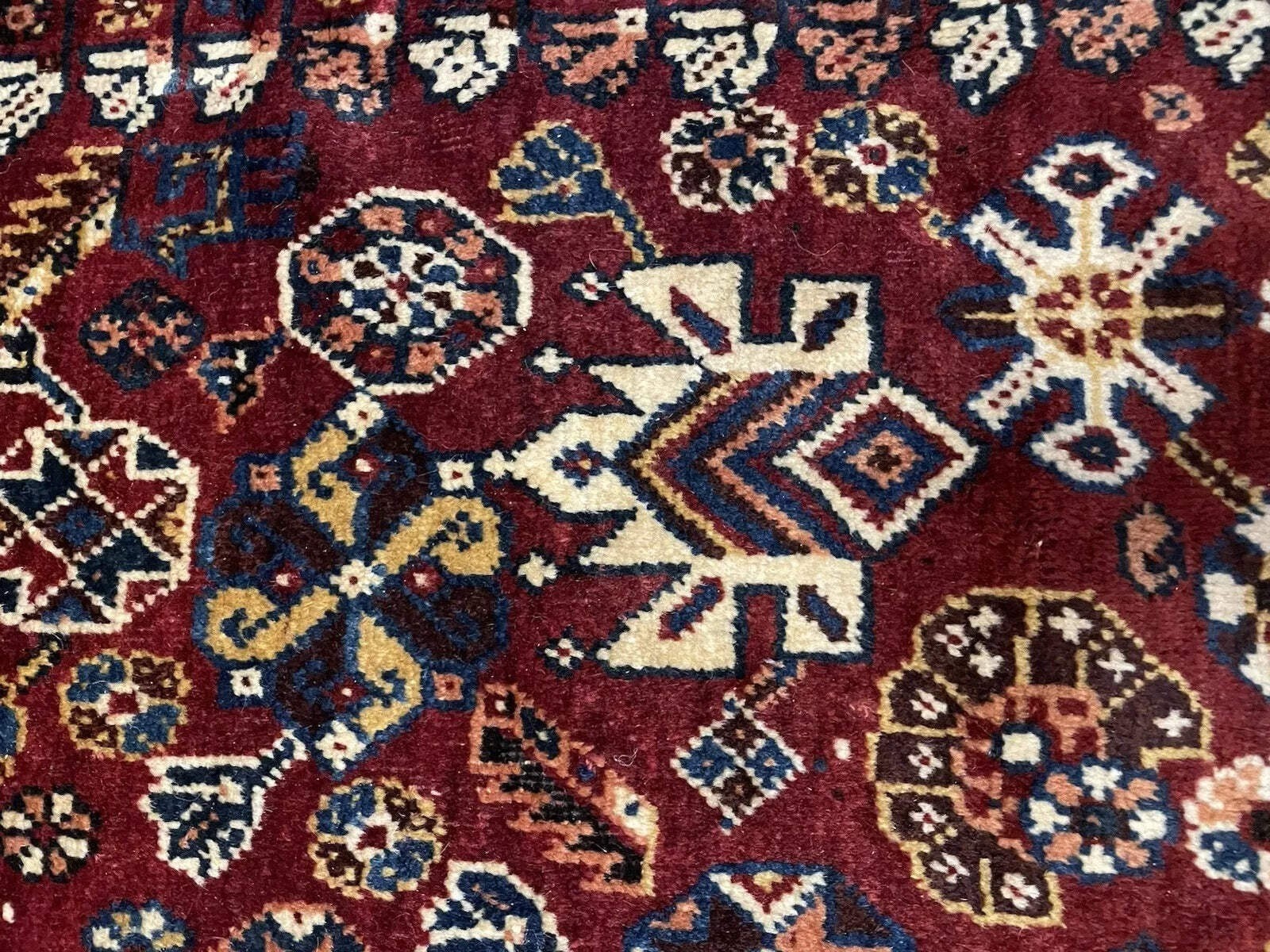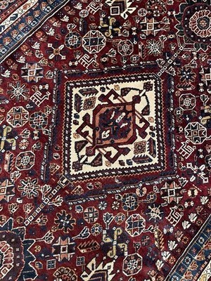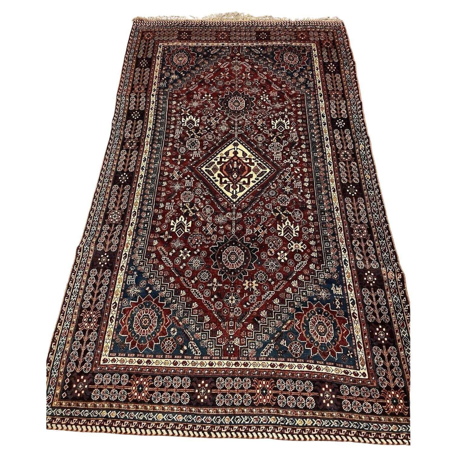 Handmade Antique Persian Gashkai Rug | 5.1' 8.9' (156 cm 271 cm) | 1930s Vibrant Tribal Storytelling ? Classic Nomadic Persian Weaving This handmade antique Persian Gashkai rug from the 1930s reveals the vibrant artistry of the Qashqai nomadic tribes of southwestern Persia. Known for their bold geometric designs and rich symbolic motifs, Gashkai rugs are treasured for both their cultural significance and enduring beauty. Woven with natural wool, this piece brings tribal storytelling to life through striking medallions and stylized animal figures. Striking Medallions and Symbolic Animal Motifs The rug features a series of large hexagonal and diamond-shaped medallions, arranged along its central axis. Set against a deep red field, these medallions contain numerous stylized birds, deer, and humanoid figures rendered in vivid white, blue, black, and accent colors. The complex geometric patterns and symbolic motifs create a dynamic and captivating visual narrative, steeped in tradition. Bold Borders and Durable Hand-Knotted Wool Surrounding the central design are multiple intricate borders filled with repeating geometric shapes and abstract tribal symbols. The hand-knotted wool pile is robust and tactile, reflecting generations of nomadic weaving skill. Despite its age, the rug remains in very good condition, with natural dyes preserving their vibrancy and depth. A Timeless Heirloom for Eclectic Interiors Measuring approximately 5.1' 8.9' (156 cm 271 cm), this antique Persian Gashkai rug is an ideal statement piece for living rooms, dining areas, or studies. Its bold tribal patterns and vivid colors make it a perfect addition to bohemian, rustic, or globally inspired spaces. This collectible rug combines utility and artistry, promising to enrich any interior with history and soul. Key Information Type: Handmade antique Persian Gashkai rugOrigin: Qashqai nomadic tribes, PersiaAge: Circa 1930sMaterial: 100% hand-knotted woolDesign: Large geometric medallions with stylized animal and human motifsStyle: Tribal nomadic weaving, geometric and symbolicColors: Deep red, white, blue, black, multi-color accentsCondition: Very good antique condition, vibrant natural dyesDimensions: 5.1' 8.9' (156 cm 271 cm)Use: Collectible decor, statement flooring, artistic display